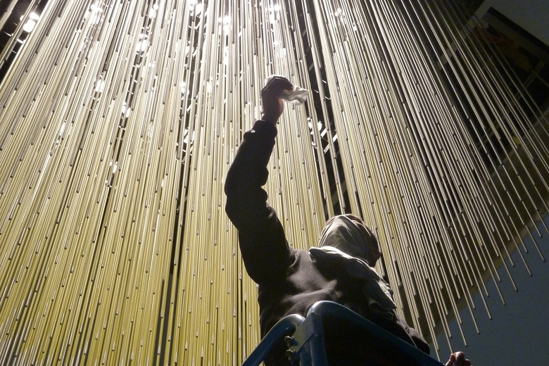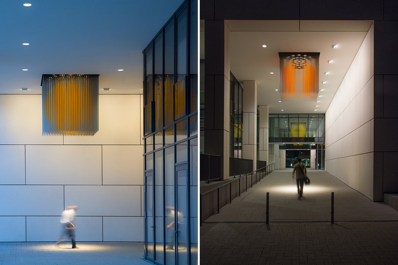 Die riesigen Metallskulpturen sind Blickpunkte, Highlights, sichtbar von außen und innen, und bilden dabei zentrale, verbindende Elemente. Jedes der drei Objekte besteht aus 1024 Edelstahlstäben, welche zusammen einen Würfel mit zwei Meter Kantenlänge bilden. Dabei sind die Stäbe in Gelb und Orange, angelehnt an die Farben eines Sonnenunterganges, so lackiert, dass sich in den Würfeln jeweils eine Kugel abbildet. Die Objekte zeugen gleichermaßen von einer Schlichtheit und Präzision wie von einer intensiven dreidimensionalen Wirkung, die für die Objekte des Bildhauers Miura typisch ist. Die Verbindung mit Licht intensiviert dies, bringt die Objekte zum Leuchten und verbindet sie mit dem Raum. Die eigens für das Objekt gefertigten LED-Spots wurden nach präziser Berechnung oberhalb des tragenden Gitterrostes angeordnet. Durch die engstrahlenden und exakt entblendeten Lichtoptiken leuchten sie die farbige Kugel aus und werfen wie ein Sonnenstrahl einen Lichtfleck auf den Boden. Besonders in Verbindung mit Wind, der die Metallstäbe in Schwingung bringt, entsteht dabei ein dezentes Schattenspiel.