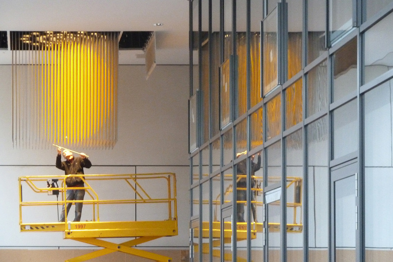 Herr Prof.Dr.-Ing.h.c. Marg von gmp brachte für die Kunst am Bau Ausschreibung als wesentlichen Akzent den Faktor „Licht“ in Verbindung mit Kunst und Architektur ins Spiel – besonders aus dem Grund, da es sich bei der gedachten Positionierung der Installation um den wichtigsten Kreuzungspunkt und gleichermaßen die am wenigsten tagesbelichteten Stelle handelte. An eben diesem Punkt durchquert der Campus übergreifende fußläufige Studentenweg den Neubau und verbindet gleichzeitig das zweigeteilte Foyer. Die Bauherren setzten mit der Wettbewerbsauslobung das Ziel eine identitätsstiftende und attraktive Markierung zu schaffen.