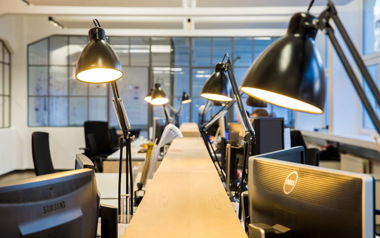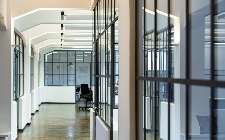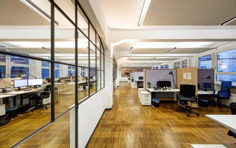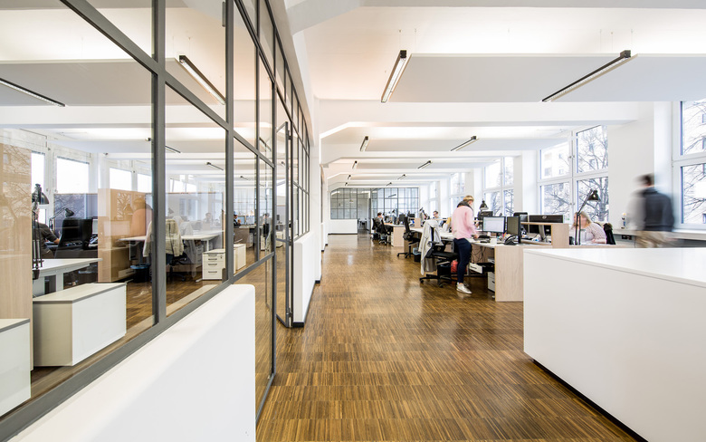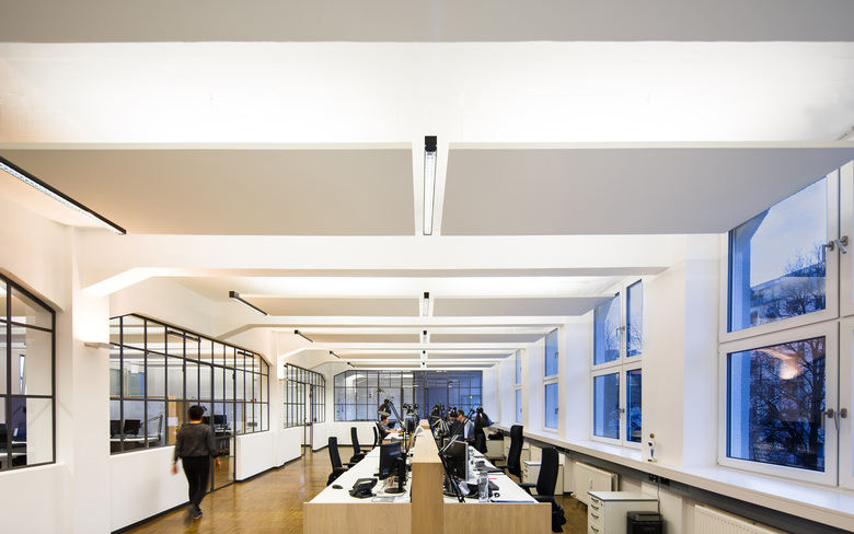 Prägend sind die transparenten Raumtrennungen mit Eisen-Sprossenfenstern und die Raumsegmentierung durch die Stützen und Unterzüge. Letzteres wurde durch die Beleuchtung dezent akzentuiert. Die allgemeine Beleuchtung wurde mit den Akustikelementen an der Decke kombiniert. Indirekte Lichtanteile sorgen für eine helle Decke. Die direkten Lichtanteile liefern die erforderlichen Beleuchtungsstärken für die Arbeitsplätze. Die gleichmäßige Raumausleuchtung zusammen mit arbeitsplatzbezogenen Tischleuchten bieten somit einen hohen Lichtkomfort, gesunde Arbeitsbeleuchtung mit der Möglichkeit diese zu individualisieren.