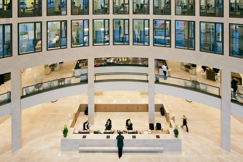 Eine dynamische Steuerung verleiht dem Gebäude einen einzigartigen Charakter durch dezente Wellenbewegungen. Für ein harmonisches Zusammenspiel von Tageslicht und Kunstlicht besteht die Allgemeinbeleuchtung hauptsächlich aus einer ausgeglichenen Kombination diffuser und brillanter Beleuchtung. Für die meisten Bereiche werden energieeffiziente Leuchten mit Hochdruckentladungs- oder Leuchtstofflampen verwendet. Lediglich hochwertige Besprechungsräume, das Kasino und Coffee-Spots werden mit Halogenstrahlern ergänzt, um eine exzellente Farbwiedergabe und Brillanz zu gewährleisten.