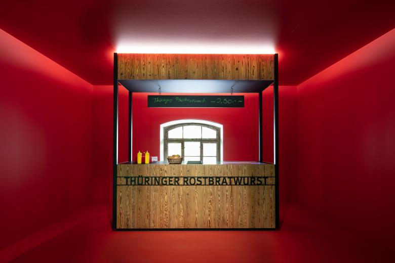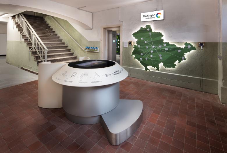 Besonders hervorzuheben ist der hohe Innovationsgrad der Ausstellung. Angefangen bei Augmented Reality in den Entdeckerlupen im Eingangsbereich, über digitale Marktplätze mit QR Code-Merklogik, bis hin zu einer raumumspannenden Projektion der Anna-Amalia-Bibliothek in Weimar, werden Thüringer Besonderheiten auf vielfältige Art vermittelt. Die digitalen Elemente der Ausstellung laden auf einer neuen Ebene zum Mitmachen ein. So kann der Besucher auf einer Hollywood-Schaukel in ein Video des Thüringer Waldes wippen, ein eigenes Bauhaus-Kunstwerk anfertigen und sogar spielerisch am Highlight-Exponat „Bratwurststand“ digital seine eigene Bratwurst brutzeln. Auch künstlerisch-szenografische Elemente, wie die Saalfelder Feengrotten, machen den hohen Innovationsgrad der Ausstellung aus. Für den zusätzlichen Charme sorgen die „Berühmten Köpfe“, wo Thüringer Persönlichkeiten vorgestellt werden und mit Hilfe von Deep Fake-Technologie sogar Martin Luther den Besuchern zuzwinkert.