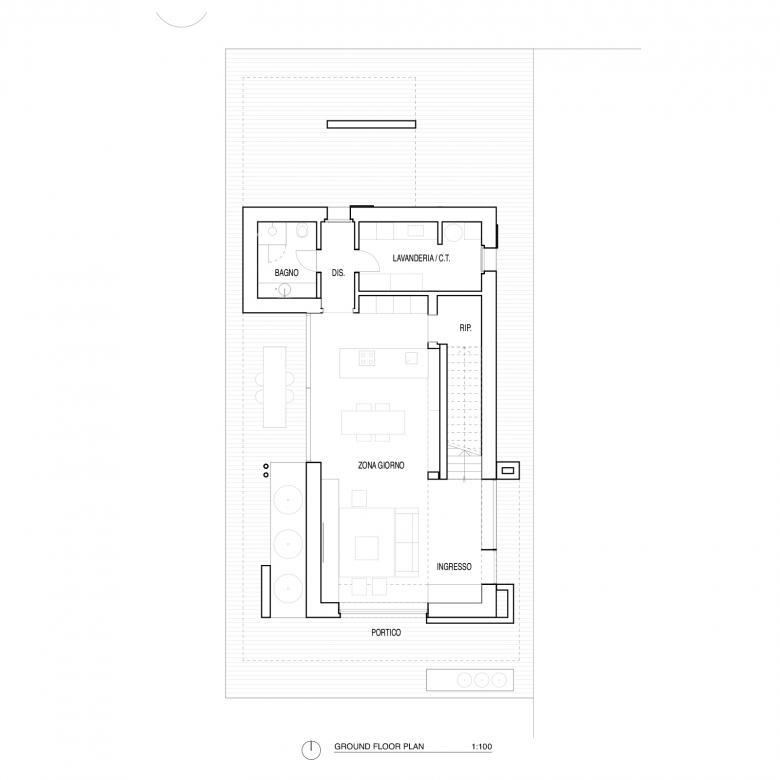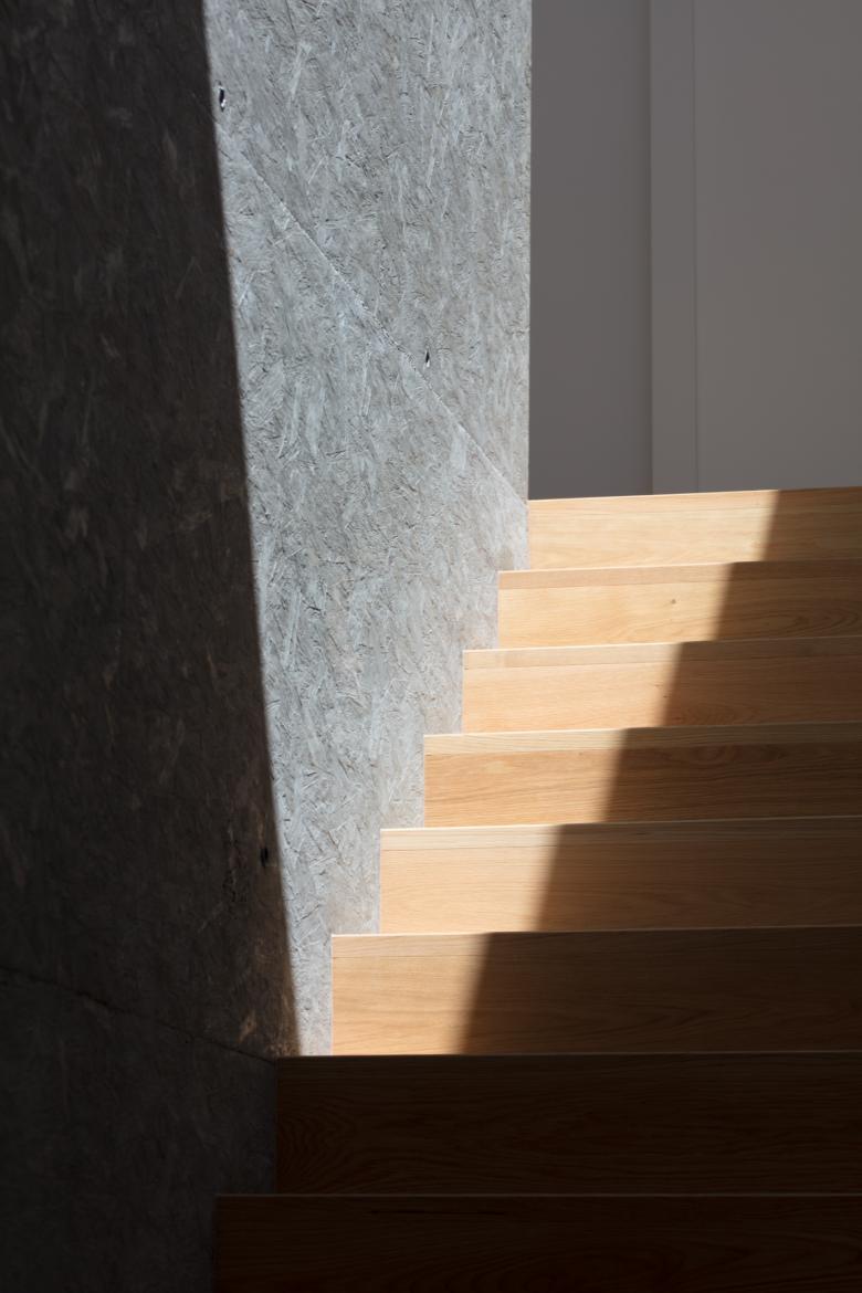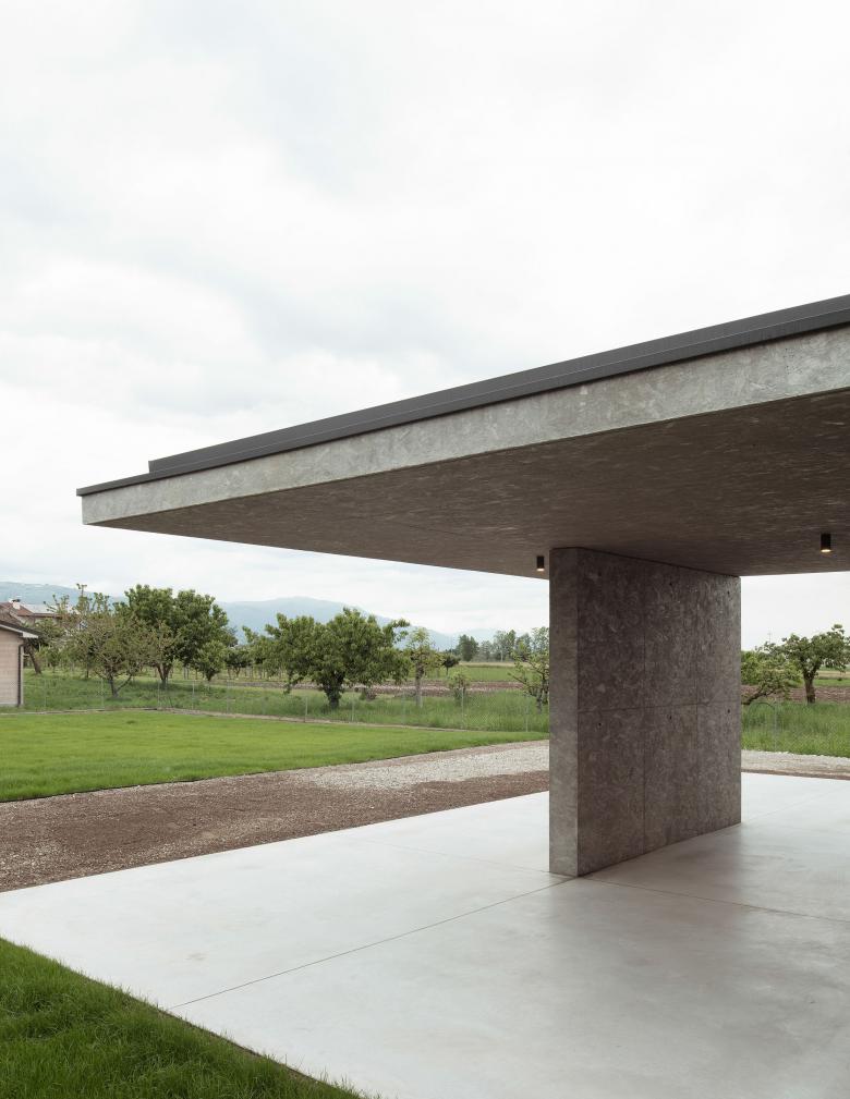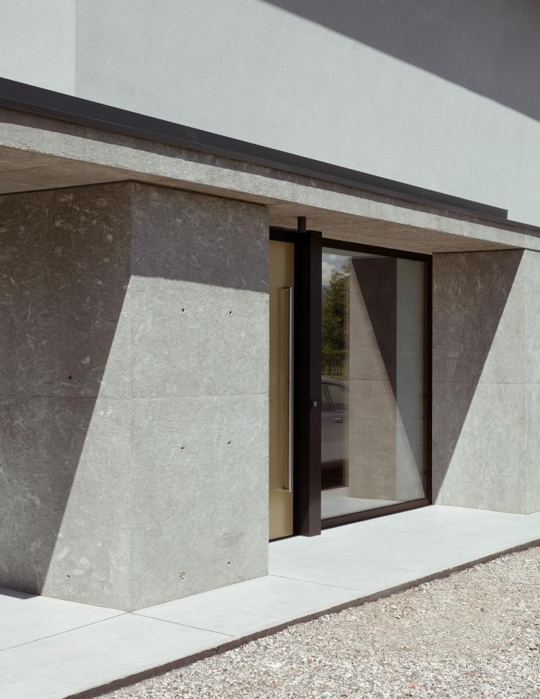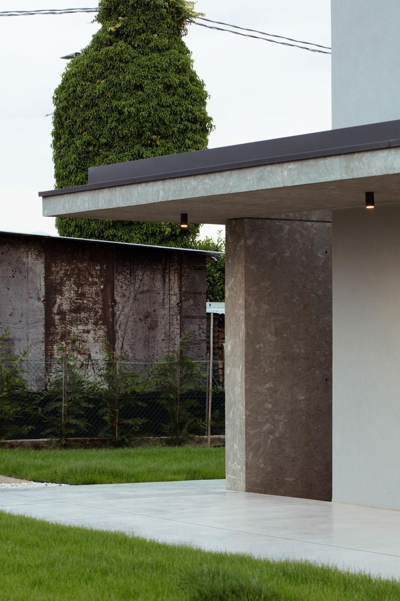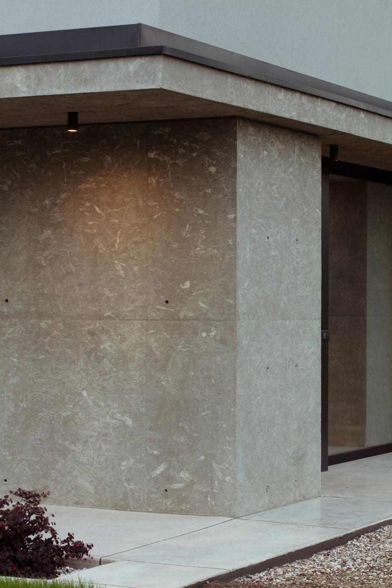 La casa si compone di un volume estremamente semplice, coronato da una copertura a due falde sul quale si attaccano delle solette a sbalzo in calcestruzzo su tutti e quattro i lati. Gli elementi in calcestruzzo, hanno una superficie increspata data dal disegno dei pannelli in osb posizionati nelle casseforme al momento del getto in opera e generano i portici della casa. All’interno lo stesso materiale è stato ripreso nel muro e parapetto della scala.