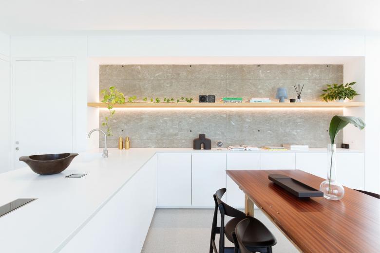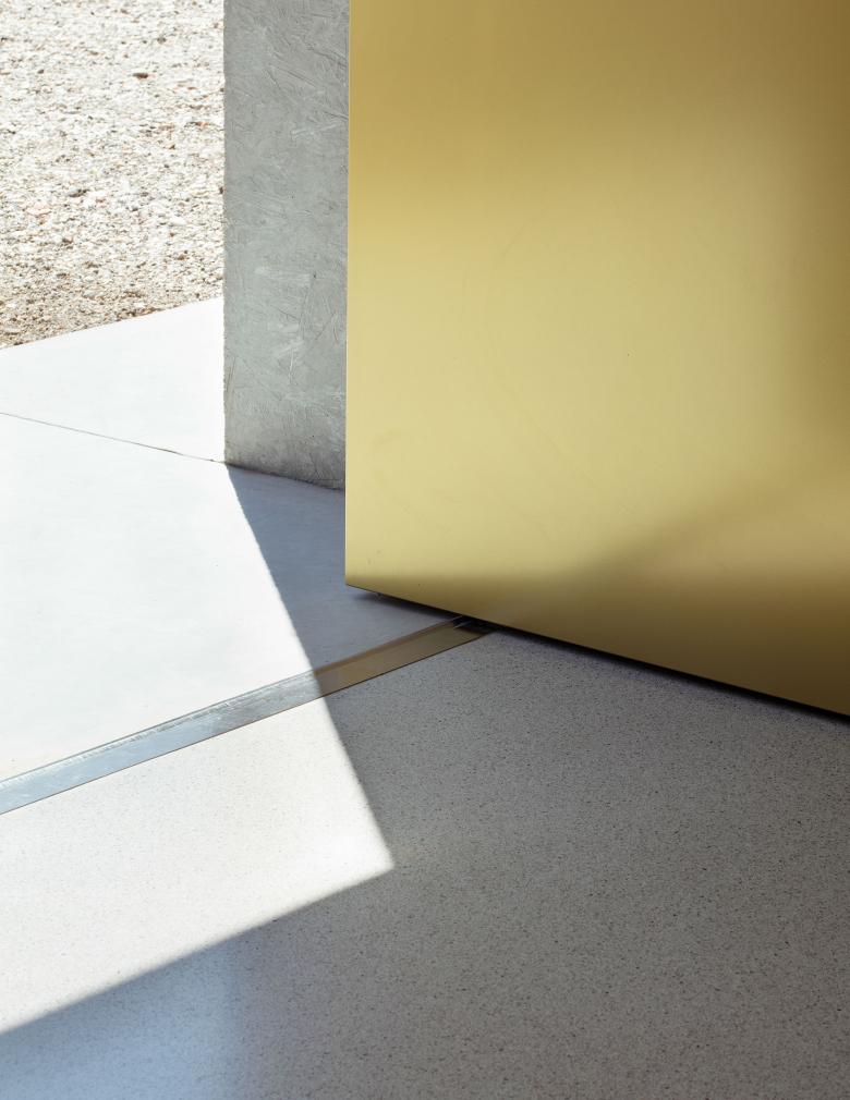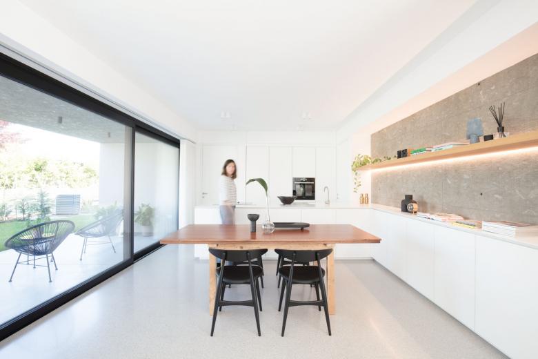 Il pavimento della zona giorno è una micro-veneziana grigia in continuità con i toni della casa. La scala in legno viene illuminata da un grande lucernario posto sopra di essa.