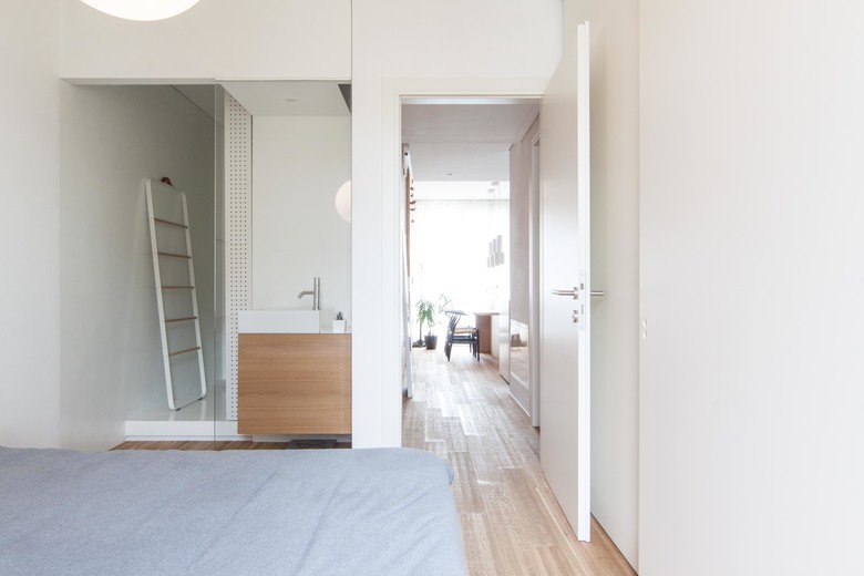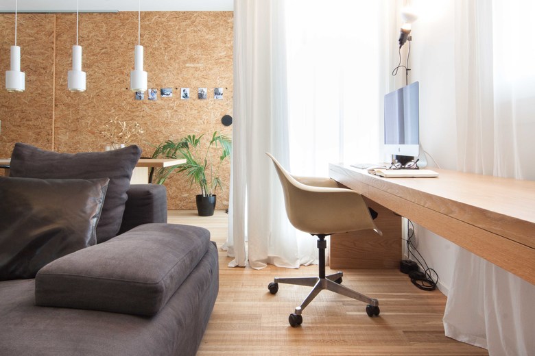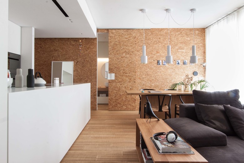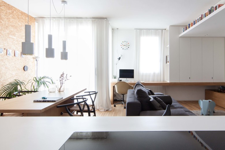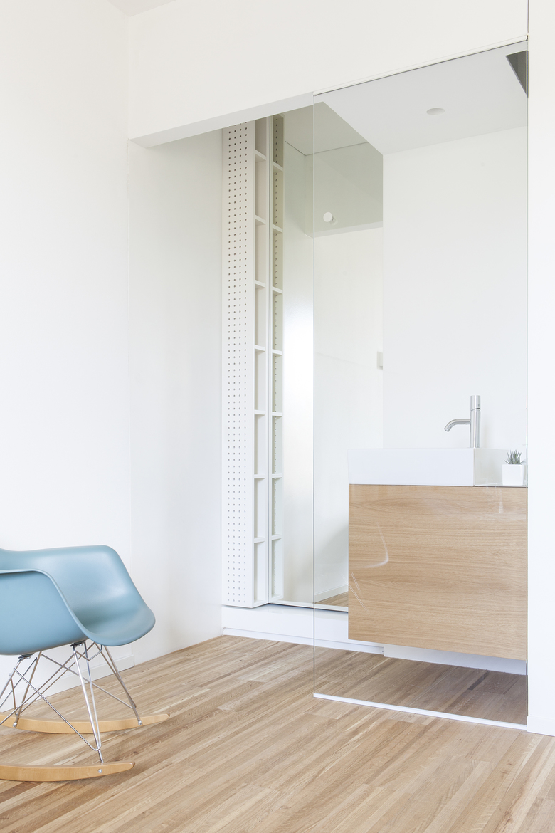 La rimodulazione spaziale ha interessato soprattutto gli ambienti di servizio, andando a riconfigurare la zona funzionale dedicata al bagno principale/lavanderia e aggiungendo un piccolo bagno di servizio annesso alla camera padronale. L’ambiente principale, che si affaccia sulla terrazza esterna, è composto da un open space in cui si sviluppa la zona soggiorno/cucina/studio e viene ampliato attraverso l’eliminazione di un corridoio di distribuzione.