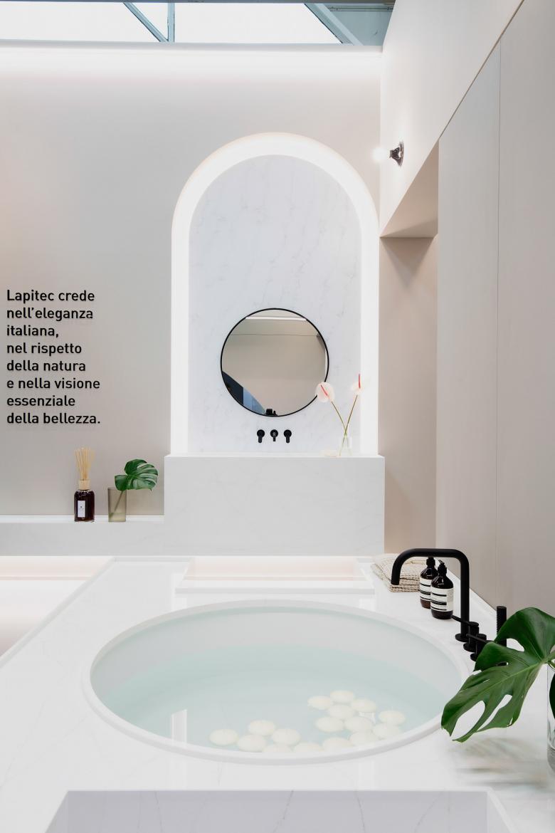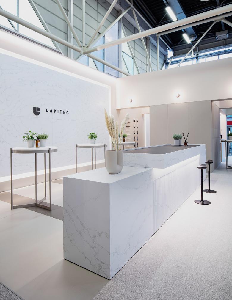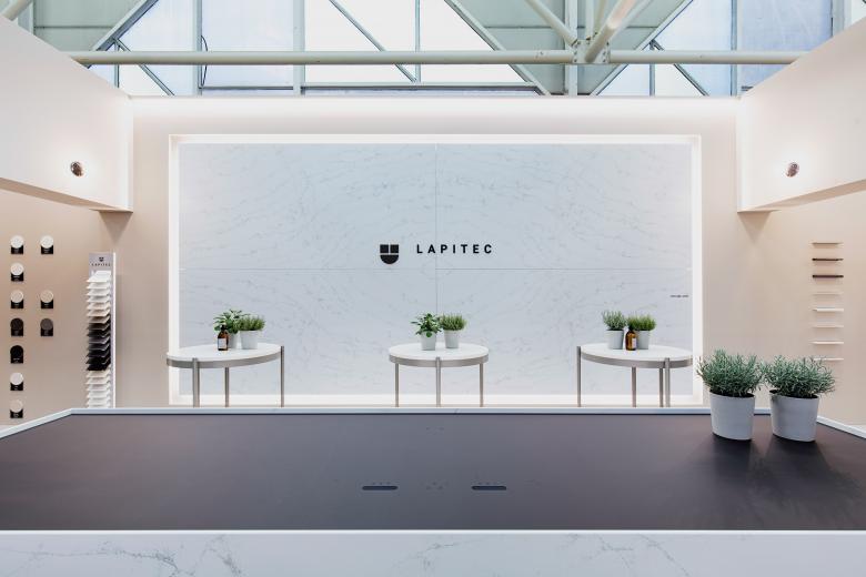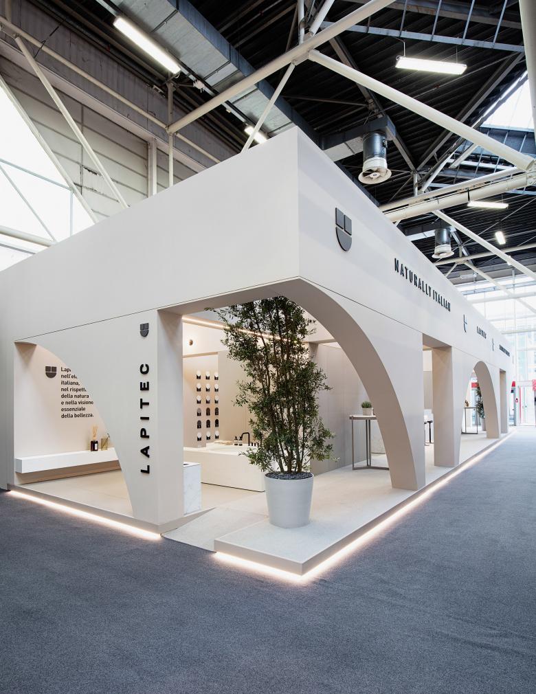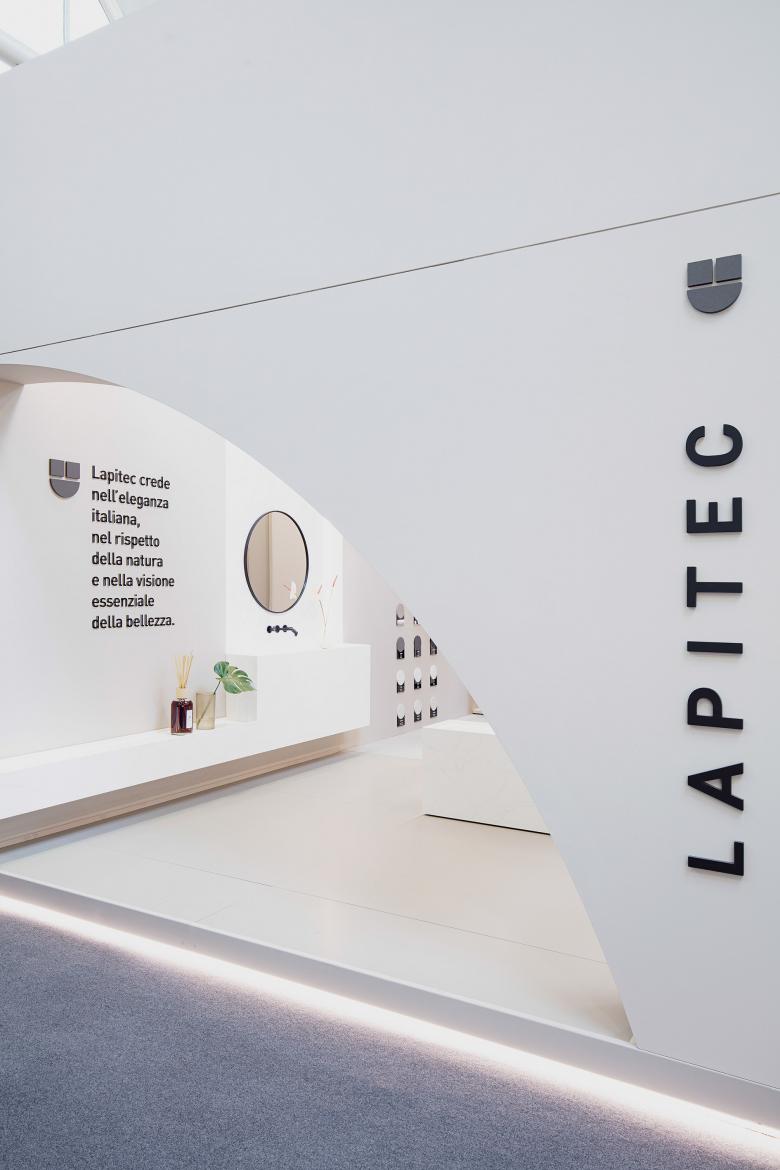 The key elements creating the structure recall the visual identity of the company with its blend of archetypal forms and symmetry. Every line and surface play its role in defining clear spaces where Lapitec is exhibited at its best.