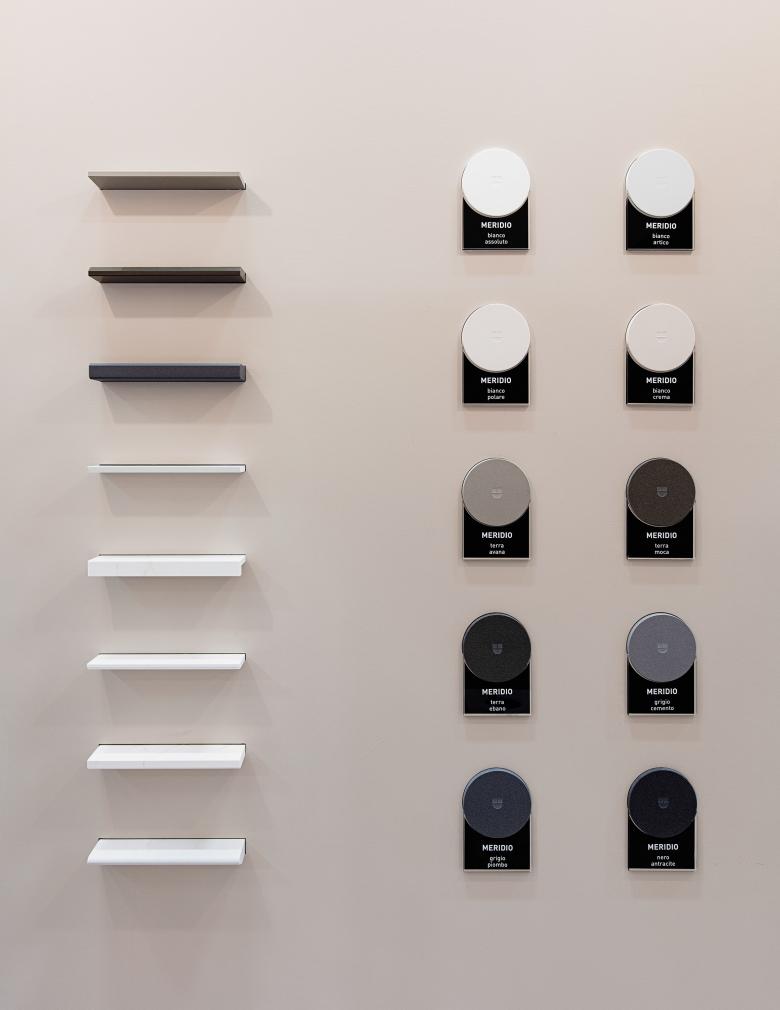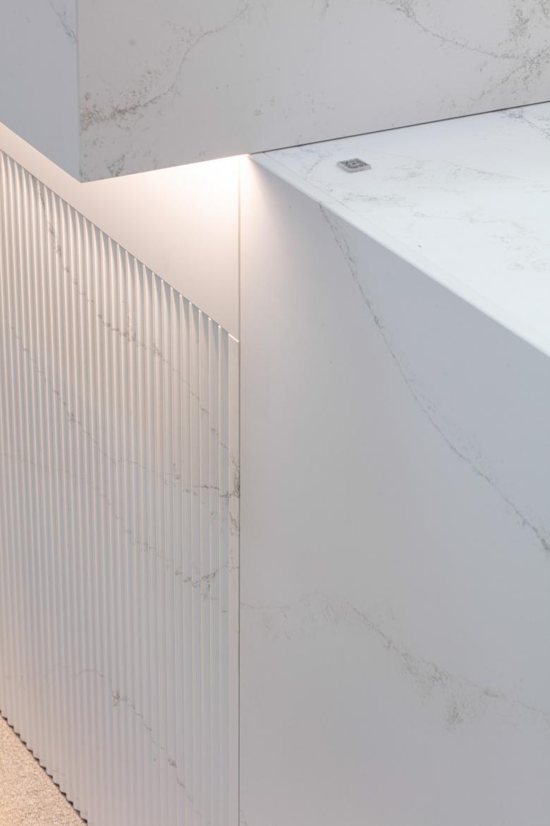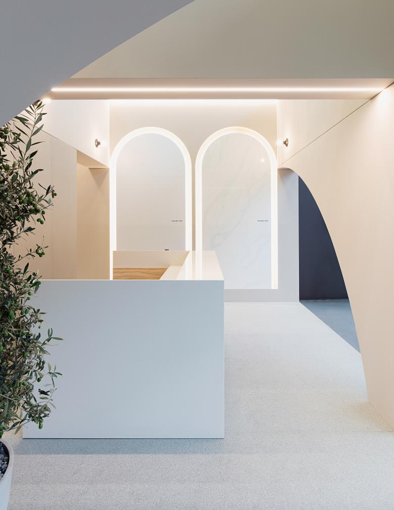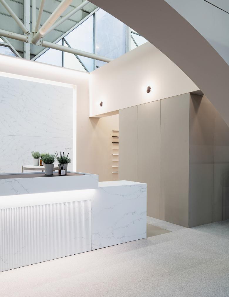 The key elements creating the structure recall the visual identity of the company with its blend of archetypal forms and symmetry. Every line and surface play its role in defining clear spaces where Lapitec is exhibited at its best.
