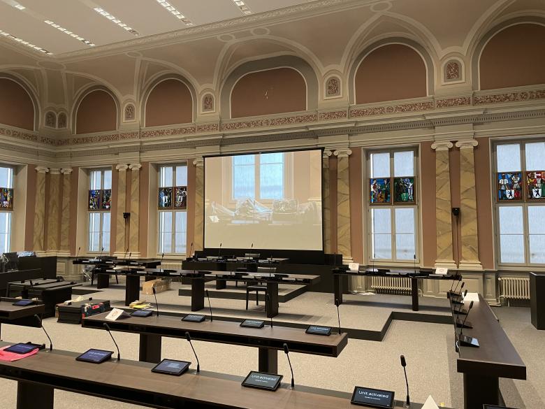 Gesamtsanierung Landratsaal im denkmalgeschützten Bestand mit zeitgemässer multimedialen Einbindung.