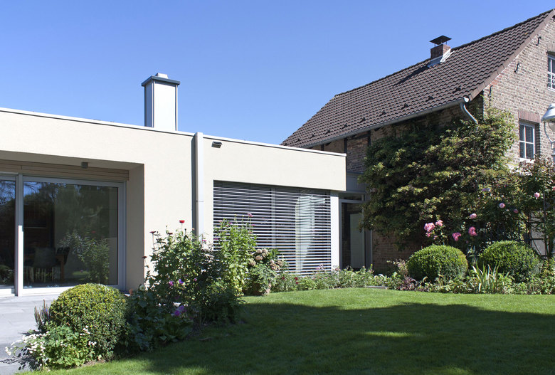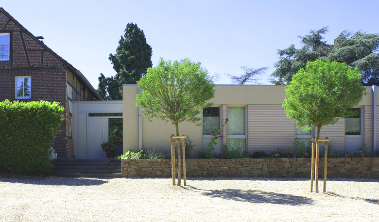 Eingebettet... – Die Erweiterung des Wohnhauses war Bauaufgabe. Das kleine historische Bauernhaus wurde um einen eingeschossigen Flachdach-Baukörper, der sich in das vorhandene Gelände mit altem Baumbestand einfügt, ergänzt.