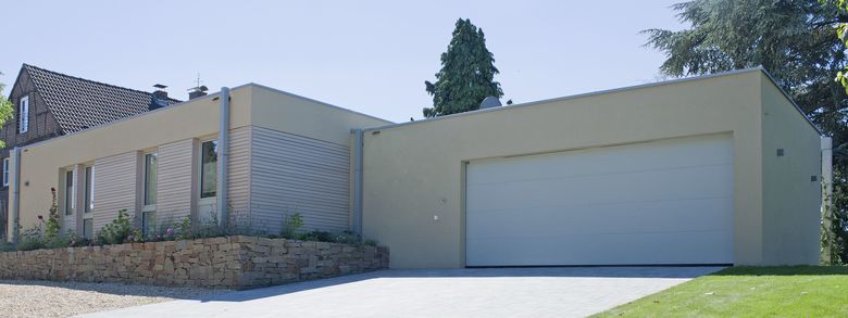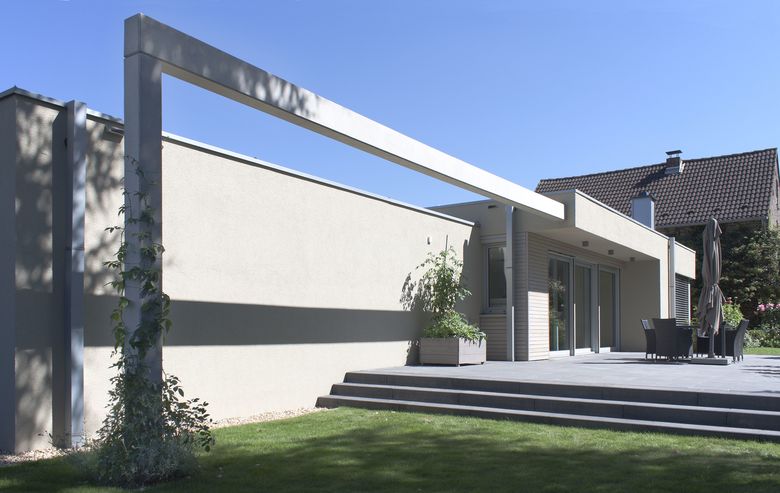 Auf der Gartenseite wird durch einen überzogene Betonbalken der neue Baukörper optisch gestreckt. Die dadurch erzielte Überproportionierung der Gebäuderückseite mit Terrasse und üppiger Begrünung sowie farblicher Zurückhaltung der Fassaden, unterstützen die Einbettung in das gewachsene Gelände und Gebäudebestand enorm.