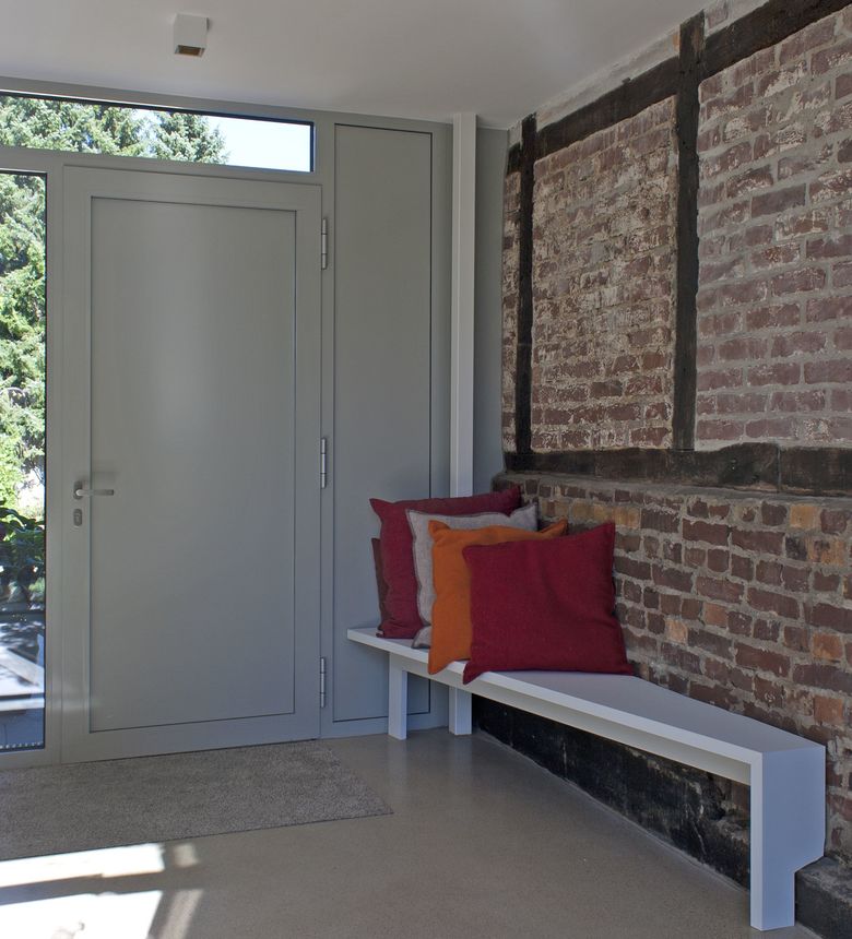 Durch die gewünschte architektonische und innenarchitektonische Verknüpfung von alt und neu wird einerseits eine spannender Kontrast der beiden Baukörper, welche über eine Aluminium-Glas-Zäsur miteinander verbunden sind, realisiert und erzielt. - Andererseits passt sich jedoch der eingeschossige Anbau durch zurückhaltende, ebenso natürliche Farb- und Materialwahl dem Bestand an.