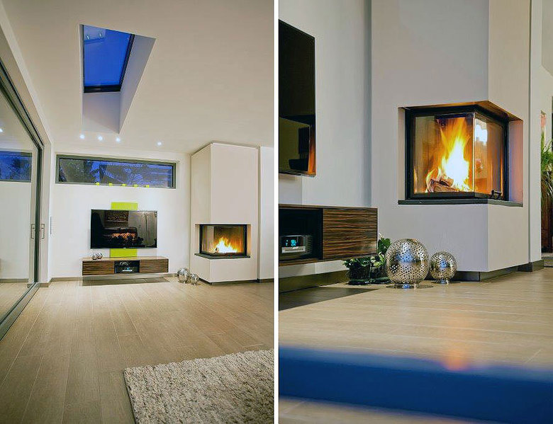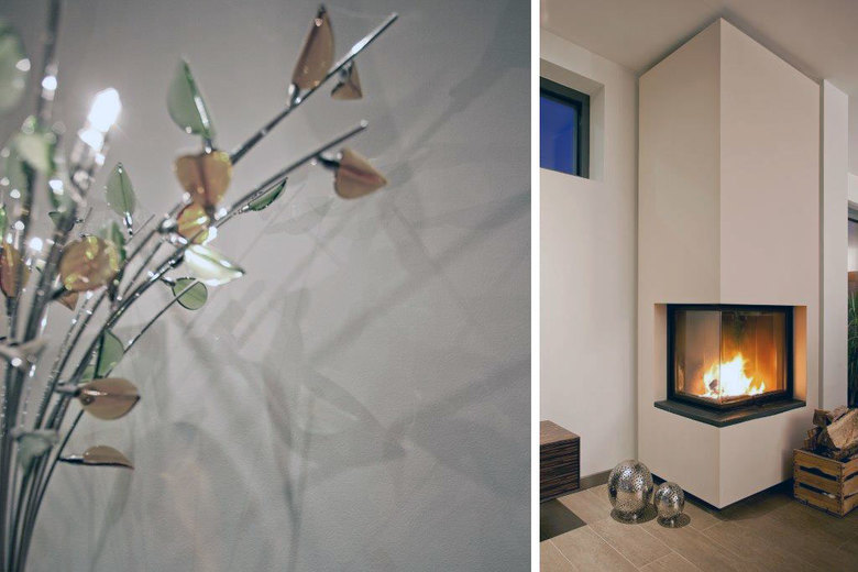 Markant und raumbildend im Bereich des Übergangs Bestand-Erweiterung positioniert sich der neue Kamin, welcher in den kalten Jahreszeiten für Wärme und gemütliche Atmosphäre sorgt. Künstliche Beleuchtung akzentuiert klare, zurückhaltende Innenarchitektur.