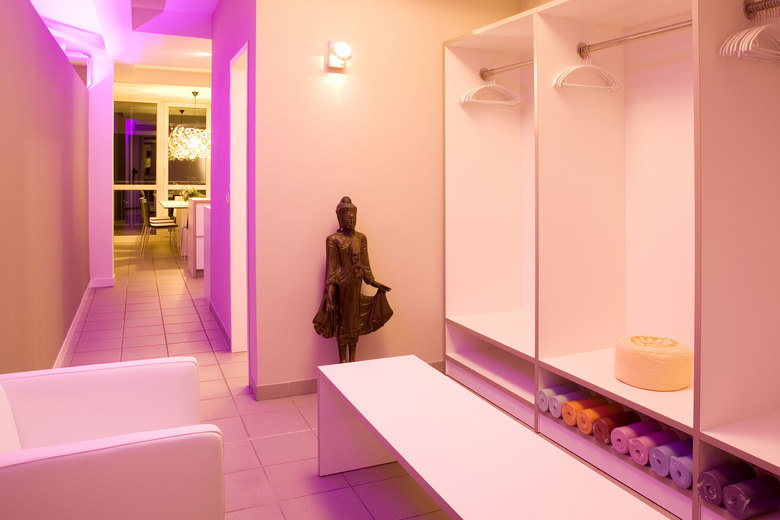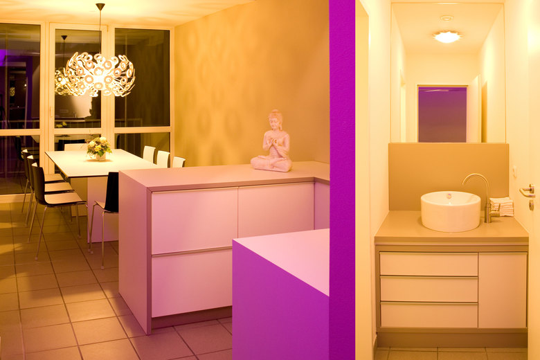 Ziel der Planungsaufgabe war die Vergrößerung und Umgestaltung des YOGA-Studios Angelika Fraikin zu einem einzigartigen, atmosphärischen Ort der Ruhe, Entspannung und Meditation. Yoga-Raum und Nebenräume werden durch eine raumbildende, freistehende Wandscheibe mit integrierter Beleuchtung und paneelartigen Filzelementen voneinander getrennt. Farbe, Material und Licht als wichtigste Bestandteile dieser Innenarchitektur lassen die Bereiche ineinander fließen und harmonisieren. Lichtstimmungen können durch modernste LED-Lichttechnik gesteuert und bereichsweise variiert werden.