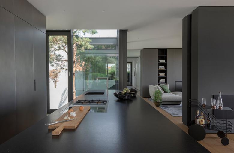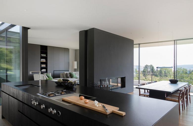 Die vorhandene Topographie war der Ausgangspunkt für den in die Länge ausgerichteten Grundriss, der aus allen Räumen Sichtbezüge nach draußen schafft und die aussichtsreiche Lage ganz selbstverständlich zum Teil der Architektur macht. Die offen gestaltete Raumfolge, lange Sichtachsen und raumhohe Filigranverglasungen in den Wohnbereichen erzeugen Durchlässigkeit und sorgen für fließende Verbindungen zwischen innen und außen.