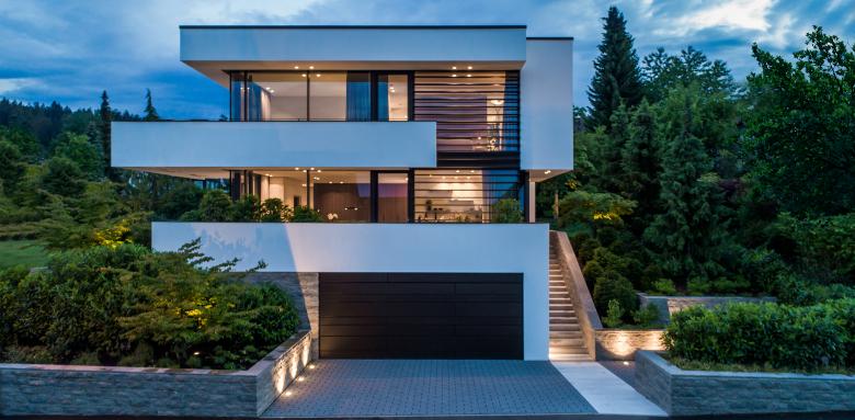 Ein Haus, das Freudenstadt Freude macht – beim Betrachten und beim Bewohnen gleichermaßen. Der moderne Entwurf der kubistischen Stadtvilla inmitten eines parkähnlichen Areals zieht Blicke an und schickt sie auf Entdeckungstour. Dabei nimmt sich der kompakte Baukörper selbst nicht so wichtig, sondern fügt sich harmonisch in die vorhandene Topografie mit ihrer leichten Hanglage ein. Der nach Süd-Osten ausgerichtete Wohn-Essbereich ist über Terrassen mit dem grosszügigen Gartengrundstück verbunden. Die üppige Bepflanzung fungiert als Sichtschutz und Grünfilter zur Straße hin und die Bauherren können neben der Morgensonne entspannende Aussichten ins Grüne genießen.