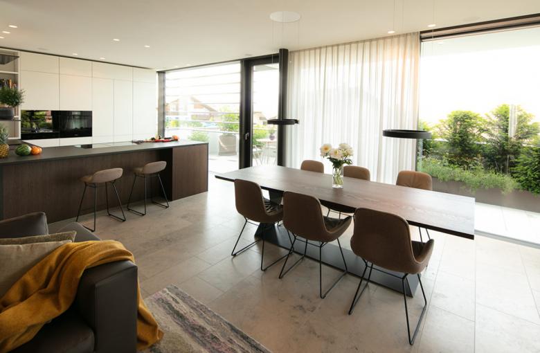 Vom Entree unter der markanten Fuge in der Fassade gelangt man ohne Umwege in den lichtdurchfluteten Wohnbereich, wo der aus tiefschwarzem Granit in die Wand integrierte Kamin das einzige Element ist, das die Rundum-Sicht nach draußen, auf den reichen Baumbestand, für einen Moment unterbricht. Der Esstisch verbindet den Wohn- mit dem Koch- und nach einem Schritt ins Freie mit dem privaten Lounge-Bereich im Garten, wo ein Außenkamin für Wohnlichkeit sorgt und die Grenzen zwischen innen und außen verwischt. Im Obergeschoss findet die Familie ihre privaten RückzugsraÅNume. Im Untergeschoss gelangt man über die Garage direkt in die offen gestaltete Garderobe. Im gesamten Haus dominieren neben weiß vor allem warme Farbtöne, Naturstein, Leder, dunkler Stahl und geräuchertes Eichenholz. Den eingesetzten Materialien wird in ihrer Reduktion und in der Mischung verschiedener haptischer Oberflächen besondere Wertschätzung entgegengebracht. So schafft die Architektur einen respektvollen Hintergrund für Möbel, Objekte und das Leben der Bewohner.