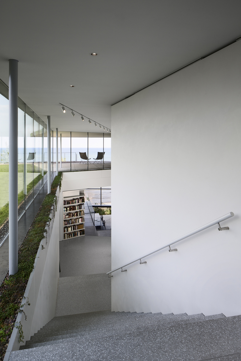 The house consists of four levels. A two story structure, windowless on the street, contains the garage, a gym, and a guest suite. This façade is unresidential in scale, but acts as foil to the monument it faces. Almost an inversion of the opposite grand stairs that lead up to the temple entrance, the main house entry is located at the top of the stair with the spaces of the house revealing themselves on the way down to the beach below. As one descends down the processional – light filled stairway the house gives itself away, beneath the typical American suburban lawn above. The architecture creates an experience, where the whole is pieced together through one’s mental landscape of moving down and through the house.