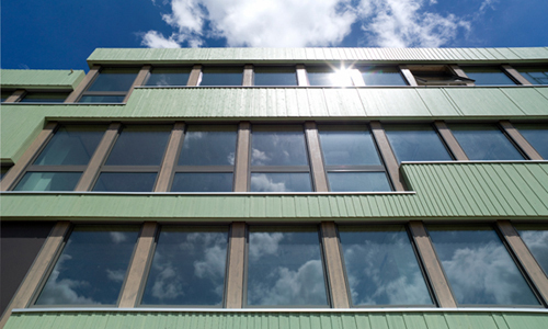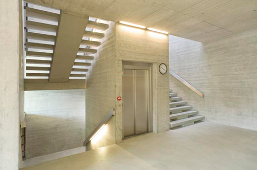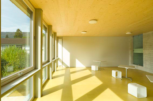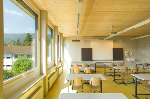 Die ausgedehnte, sternförmige Schulanlage, die bereits mehrmals erweitert wurde, erhält einen präzisen und kompakten Baukörper hinzugefügt. Die von den bestehenden Bauten losgelöste Erweiterung ermöglicht es, die Qualitäten der Aussenräume zu wahren und weiterzuführen. Die Schnittlösung mit Splittlevel ergibt eine sinnvolle Verteilung des heterogenen Programmes: Mensa mit Küche, Werkräume, Bibliothek, Schüleraufenthalt, Lehrerzimmer, Zeichensäle und Klassenzimmer. Die Gebäudestruktur aus Holz ist modular konzipiert: sie lässt sich entlang des aussteifenden Erschliessungskernes aus Beton vertikal erweitern und sich den ändernden Bedürfnissen der Benutzer anpassen. Die Fassade aus farbigem Holz zieht sich in Form von durchgehenden Bändern um das Gebäude, deren Höhen sich mit den verschiedenen Funktionen und versetzten Geschossdecken verändern. Das Tragsystem soll weitgehend vorfabriziert werden, um die Bauimmissionen auf ein Minimum zu reduzieren. Der Neubau erfüllt die Anforderungen des Minergie-Standards.