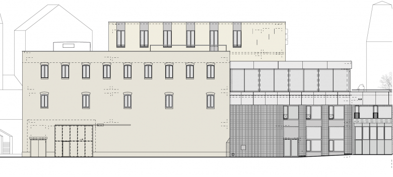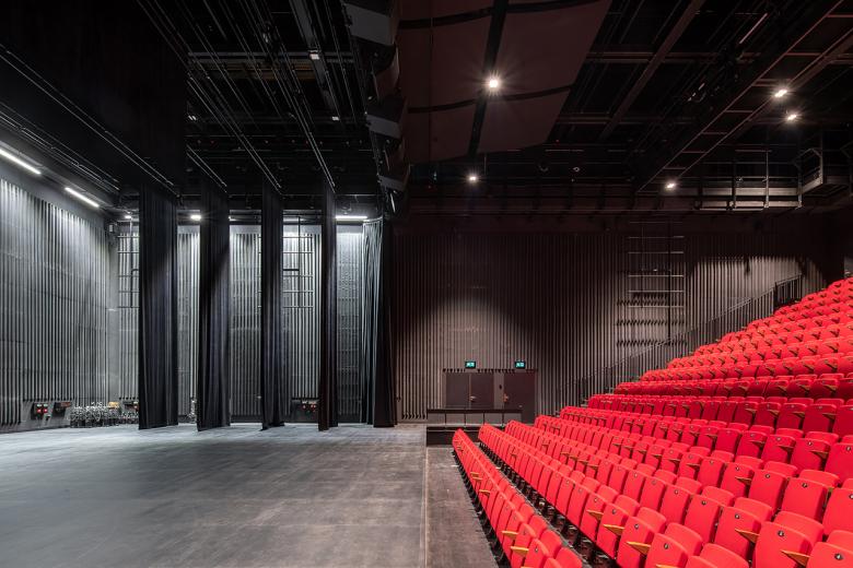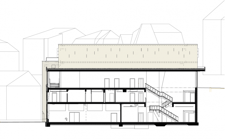 Das neue Jurassische Kantonstheater verknüpft die Überbauung mit der auf der Hügelkuppe gelegenen Altstadt. Es wird als kompakter Baukörper in die bestehende Topografie und hinter die erhaltene Fassade der alten Brauerei eingepasst. Der Publikumseingang erfolgt über die hangseitige Route de Bâle und den neuen Theaterplatz. Die dreiseitig verglaste Eingangshalle fungiert als Erweiterung des Stadtraumes in Richtung vom Foyer, das sich kaskadenartig rund um die Haupttreppe nach unten über zwei weiteren Ebenen entwickelt. Diese Geschosse ermöglichen den Zugang zum grossen Saal, auf Höhe der oberen, bzw. der unteren Ebene der Teleskoptribüne. Diese lässt sich nach Bedarf nach hinten in eine Wandnische einfahren und macht aus dem bestuhlten Theatersaal für 450 Zuschauer einen ebenerdigen Veranstaltungsraum für 840 Besucher. Dem Black- box-Konzept entsprechend ist die gesamte Theatertechnik über eine vollflächig begehbare Gitterdecke frei bespielbar. Die Saal-Akustik ist primär über die Wandoberflächen aus Wellbeton gewährleistet. Bewegliche Vorhangsflächen sowie Reflektionspaneele ermöglichen die Feineinstellung auf die Bedürfnisse der einzelnen Veranstaltungen. Die Bühne und ihre Nebenbereiche werden stufenlos über die untere Rue de la Brasserie angeliefert. Das gesamte Gebäudekonzept entwickelt sich aus den topografischen Verhältnissen und prägt die dicht bebaute Hügelflanke der Altstadt.