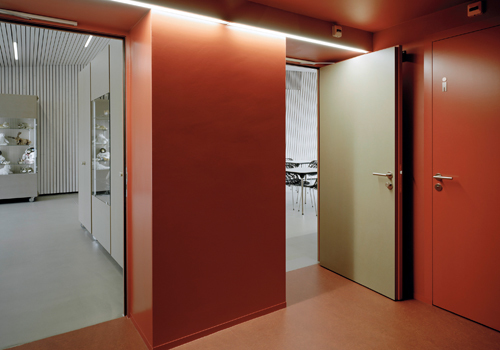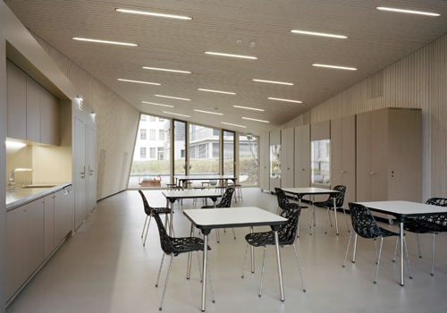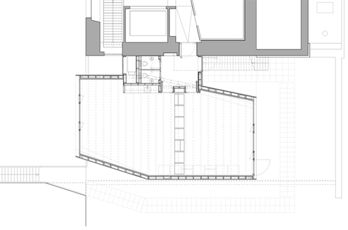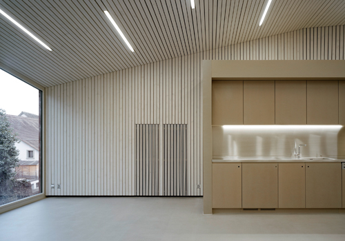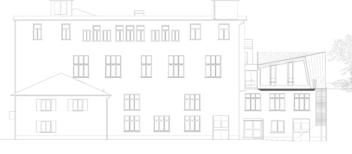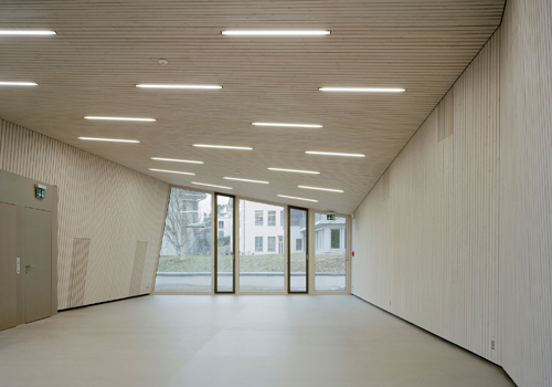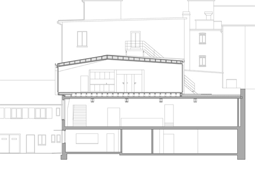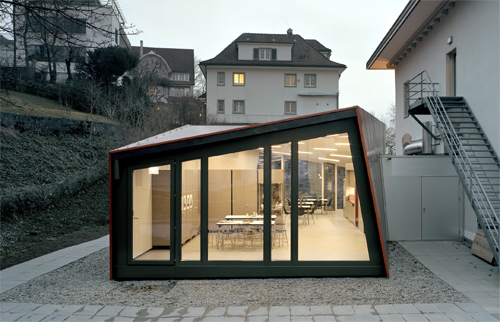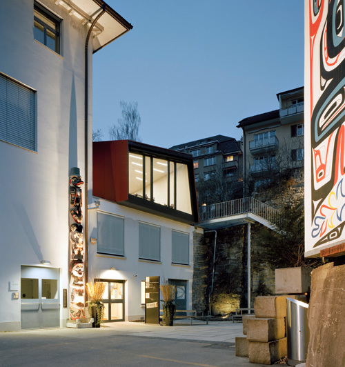 Der neue Mehrzweckraum ist als zeltartiger Pavillon auf dem Dach des rückseitigen Anbaus der ehemaligen Brauerei konzipiert. Vom Eingangshof am Fuss der imposanten Stützmauer gesehen, wirkt er als Zeichen für die heutige Nutzung des Gebäudes: ein fremder Kopf, wie ein Totem auf das Dach des Industriebaus aufgesetzt. Der Aussenraum fliesst visuell nicht nur rund um den freistehend wirkenden Neubau, sondern auch durch das an beiden Enden verglaste Gebäude hindurch. Der Mehrzweckraum wird lediglich durch einen kompakten Körper mit dem Museum verbunden, in welchem auch die Toiletten integriert sind. Das Tragwerk besteht aus beidseitig verkleideten Holzrahmen. Eine vor der Dämmebene aufgespannte und verschweisste Dachfolie bildet die Aussenhülle. Form und Struktur des Gebäudes sowie die geprägte, kupferfarbene Oberfläche erinnern an die traditionelle Bauweise von Zelten, Booten oder Alltagsgefässen aus Holzgeflechten und gegerbten Tierhäuten. Der Anbau wurde zum Holzpreis Schweiz 2009 mit einer Auszeichnung prämiert.