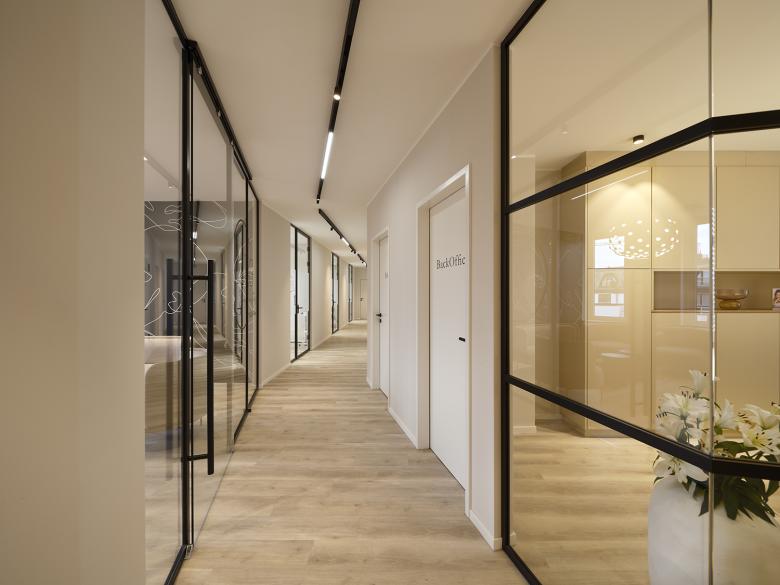 Direkt beim Betreten der neuen Räumlichkeiten erleben die Patient:innen den leichten und offenen Loft-Charakter – mit einem einmaligen und unverkennbaren Ambiente. Der großzügige Eingangsbereich sorgt beim ersten Einblick für einen beeindruckenden „Aha-Effekt“. Ein Counter, welcher an den Empfang eines exklusiven Hotels erinnert, schenkt direktes Wohlgefühl. Moderne, kombiniert mit besonderer Gemütlichkeit. Dafür sorgt unter anderem der durchlaufende, helle Bodenbelag in Holzoptik. Die Praxis gewinnt an besonderem Charme durch die hellen, hohen Räume sowie die schlichte Leichtigkeit des Einrichtungsdesigns. Raumhohe Verglasungen, dezente Natur-Farben, hochwertige Materialien sowie eine angenehm warme Beleuchtung schaffen dieses besondere Ambiente. Trotz der Raumhöhe und überwiegend glatten Oberflächen nimmt man direkt die angenehme Akustik der Räume wahr. Dafür sorgen ausgewählte Akustikdecken und spezielle Schallschutztüren.