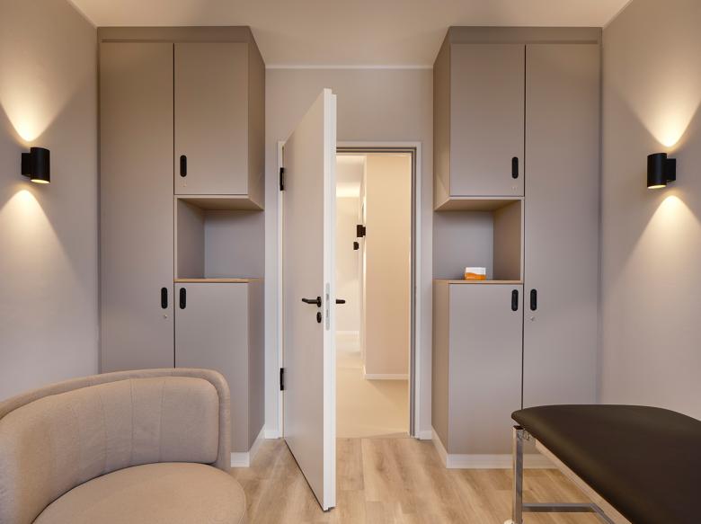 Als Eyecatcher kommen an ausgewählten Orten exklusive Designtapeten zum Einsatz. Raumhohe Schiebeelemente im Factory-Style gewähren Ein- und Durchblick zum großzügigen Wartebereich und verleihen den Räumlichkeiten diesen einmaligen Loft-Charakter. Der Wartebereich wurde in zart abgetönten Farben gestaltet, akzentuiert durch einen Anthrazitton, welcher sich in einigen Möbeln und Elementen der Praxisräume geschmackvoll wiederfindet. Moderne, gemütliche Sessel in angenehmer Wollhaptik laden zum entspannten Verweilen ein. Für Erfrischungen steht ein Servicepoint bereit, an dem sich die Wartenden bedienen dürfen. Ein harmonisches Gesamtergebnis in dem sich wirklich jeder wohlfühlen kann.