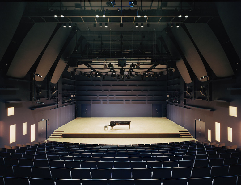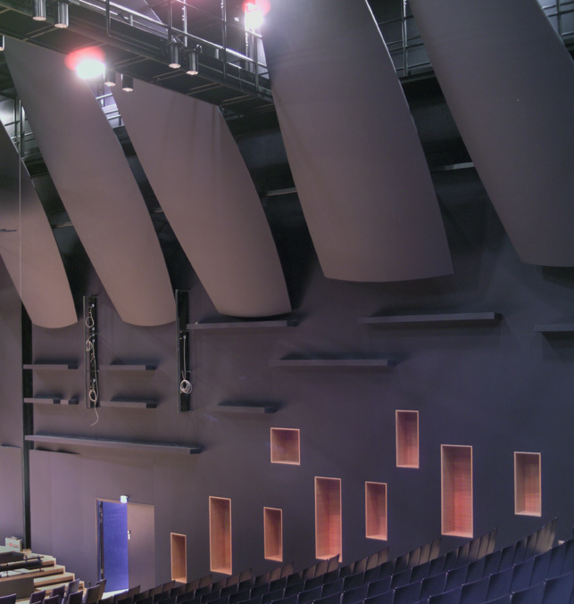 The basis of the hall is a simple rectangular space. Its character – formed by lit recesses on the walls, vertical shelves in the centre part of the walls, “acoustic sails” in the top part of the walls, “acoustic clouds” above the stage, obliquely stepped walls on the sides of the stage, tilted rear wall and side parts, a wooden relief on the rear wall – developed in close collaboration with an acoustician. The location of the hall presented exceptionally strict sound insulation requirements because of background noise. The solution was to float the hall separately from the rest of the building frame, following the principle of a room within a room.