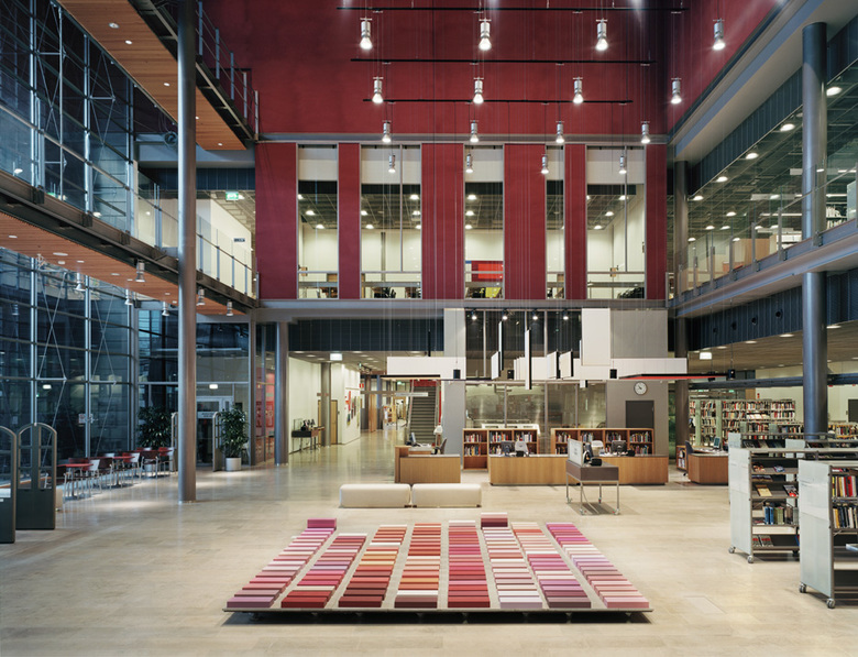 The interiors of the library have a light, airy look with balustrades and partition walls of glass and steel. The large steel trusses stiffening the frame also serve as architectural elements.