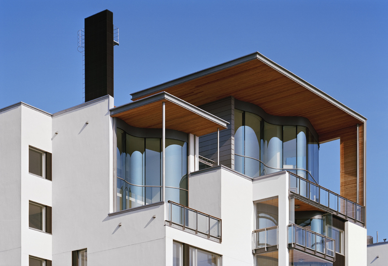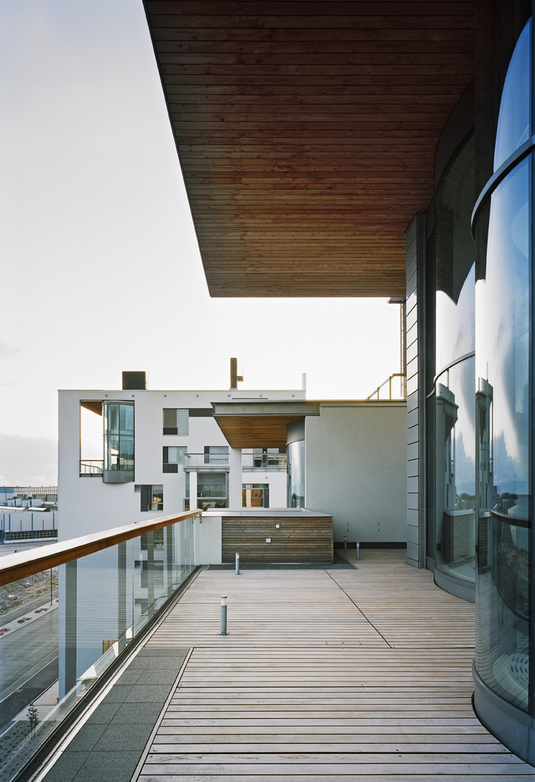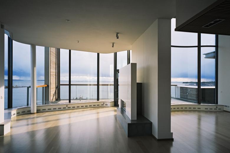 The total number of flats is 45. All are adaptable, the sizes varying from 80 m² to 270 m². Each flat has a sauna or a large tub in connection with the bathroom, a balcony or terrace and a fireplace. The room height is over three metres. The main living spaces of all flats – in the largest ones also the dining room, library-study and master bedroom – open up to the sea. The topmost, two-storey studios have views also of the historic Eira and sunset from their terraces. The back walls of the balconies of the flats facing the sea are undulating picture windows extending from floor to ceiling.