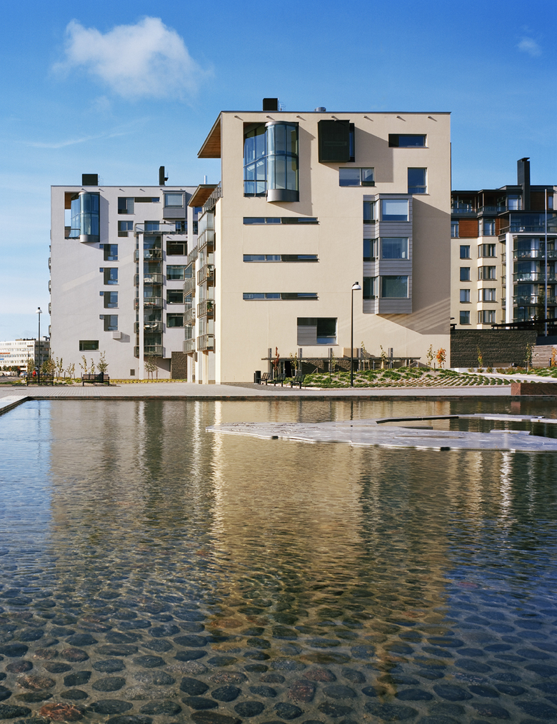 The new buildings relate to the consistent villa district of Eira, east of the new residential site, built on the basis of Lars Sonck’s town plan scheme in 1910–14. The three blocks of flats stand on the front line against the sea; all flats afford unimpeded views of the Gulf of Finland and the archipelago off Helsinki. Close by are the historic Kaivopuisto park, a waterfront boulevard with cafes, harbours with connections to the beaches and restaurants of the nearby islands, and boat piers of yacht clubs.