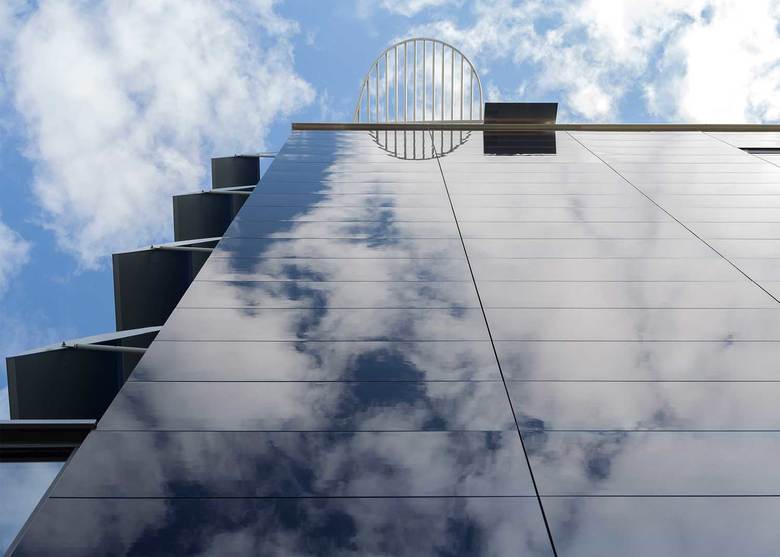 The exterior appearance of the building is defined by acid-proof sheet steel panels, aviation-related wing-like sunshades of office windows and pergola canopies on a roof terrace. Based on nanotechnology, the facade cladding is the first of its kind in Finland both as an architectural element and as a technical solution. By means of nanotechnology, the thickness of the oxide layer on sheet steel panels has been adjusted to reflect only the blue wavelengths of sunlight. The hue on the surface of the steel panels changes along with changing daylight as the result of an electrochemical reaction, and the colour of the surface can be influenced by changing the duration of panel treatment. This treatment combination made it possible to achieve a facade that is powerfully vivid owing to the impact of the environment and the direction of sunlight.