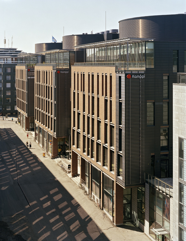 At the completion of the Kamppi Centre in 2006 Helsinki got a new heart. The new structure is bound to the existing one functionally and physically. The Kamppi Centre is a mixed-use complex, where dwelling, offices, commercial operations and public transportation interlace and connect to Helsinki’s largest uninterrupted bicycle and pedestrian zone including a varied sequence of squares. The most western square, Tennispalatsiaukio, is a green oasis surrounded by cafes and restaurants with summer and winter terraces, the Tennispalatsi cinema and museum centre and many retail services. The functional organisation of Kamppi corresponds to topical ecological objectives. The shopping mall and workplaces are accessible with public transportation, the centre being a hub of traffic. There are no parking spaces allocated to the flats. Versatile operations make the centre lively around the clock.
