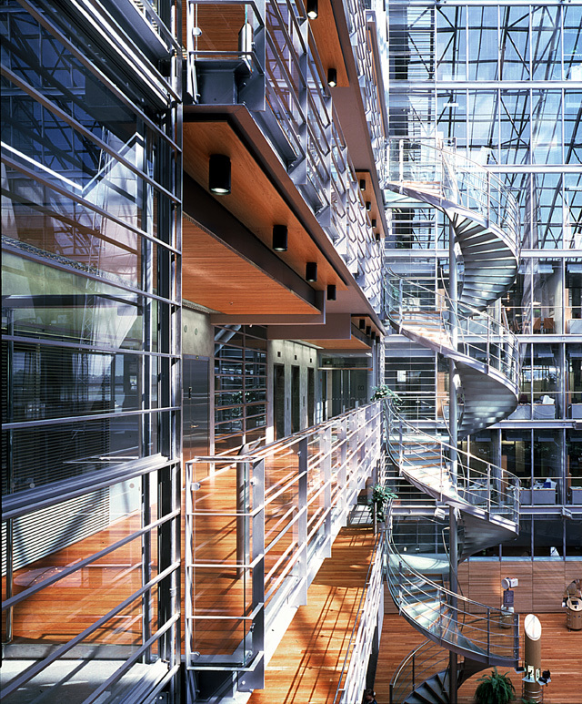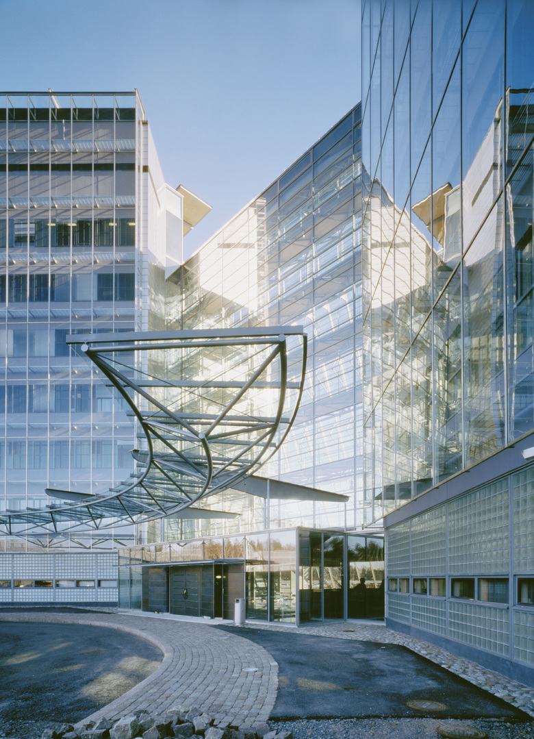 The transparent exterior architecture refers to the possibilities of new technology in advancing human interaction. The visible materials are recyclable, easy to maintain and long-lasting: glass, acid-proof steel and a small amount of aluminium lattice. The first double-skin facade in the Nordic Countries saves energy by means of computer-controlled valves and blinds installed in the interspace. The solution was devised in collaboration between the architects and the client, because there was no model for a system functioning in the same way. The material choices of the interiors are based on authenticity: reddish wood species, exposed steel in load-bearing and non-load-bearing structures, greenish grey paint applied with a spatula on stiffening reinforced concrete towers.