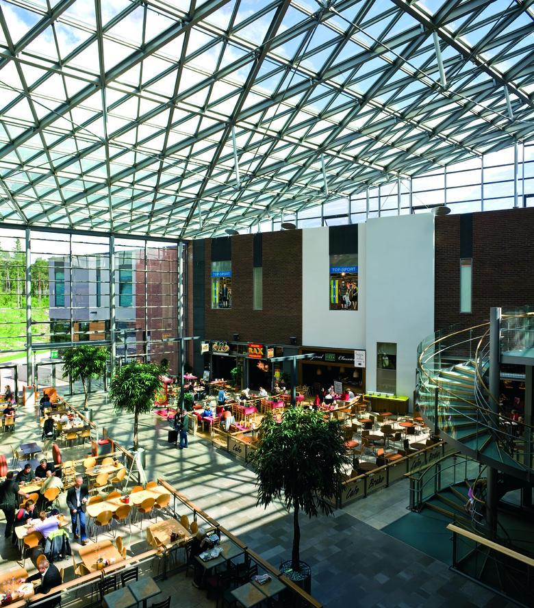 The shopping corridors are interrupted by a sequence of multiform, diverse and well-lit interior courtyards. Daylight comes in through steel- structured glass roofs, whose triangular panes reflect shadow patterns on the walls on sunny days. They were designed as mesh structures without strongly three-dimensional supports.