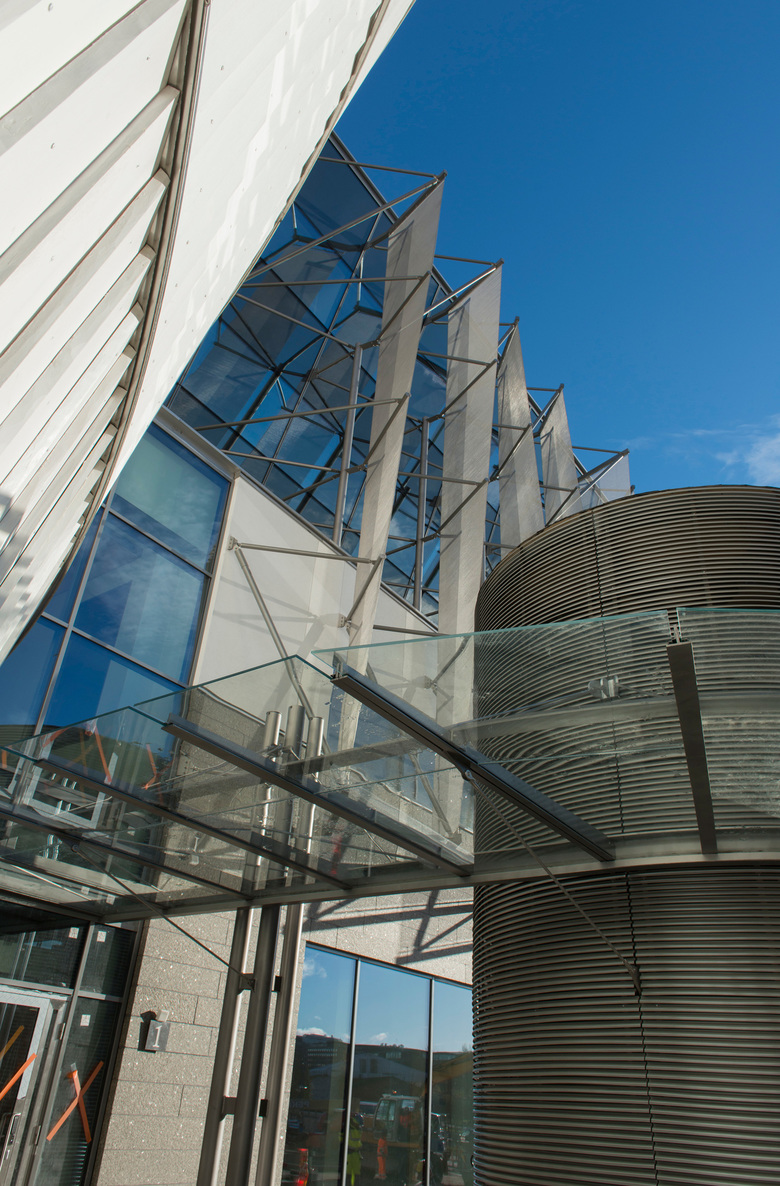 The client’s objective was top-quality architecture in terms of both functionality and aesthetics, yet within reasonable costs. The detailed plan did not enable using wood to the maximum, so the building is a combination of plan provisions and wooden surfaces. The formal motifs of the exterior are abstracted references to wood: the Bioforum Gallery is a piece of stump and the bridge crossing Alvar Aallon katu street a bevelled polyhedron. Both are clad with timber. Ecology and advanced energy saving prompted the helical sunshades made of refined steel mesh, the material of the machine clothing used in paper processing. The floors of outdoor terraces are made of UPM ProFi boards.