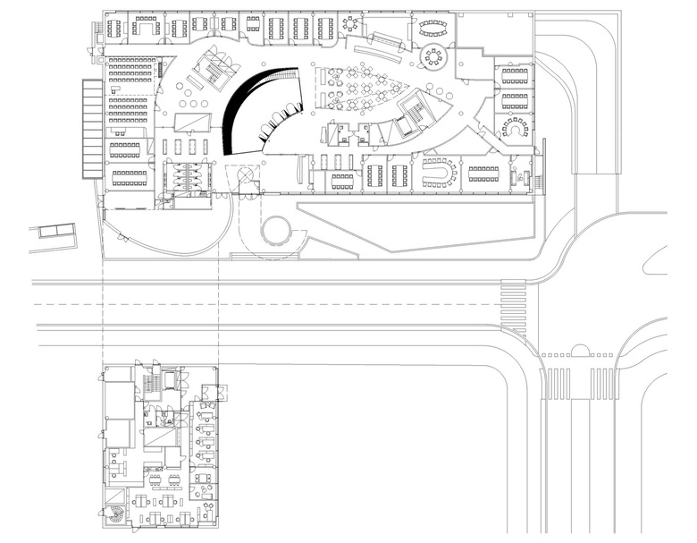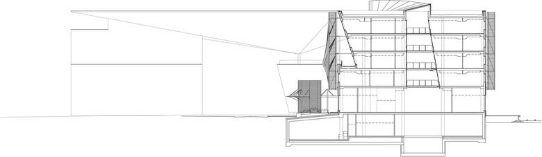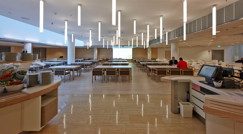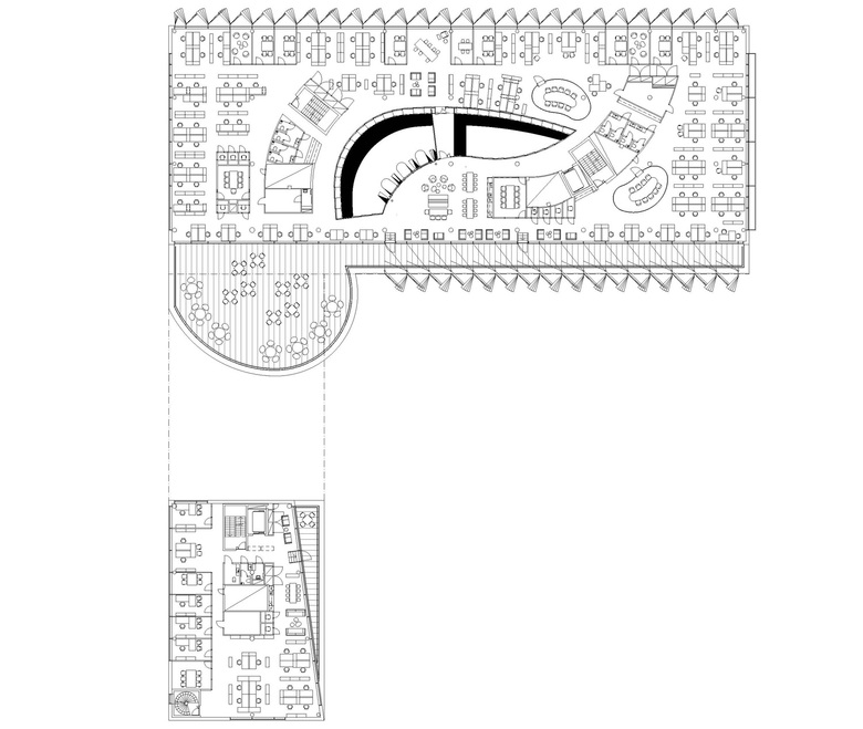 The offices, designed for 450 employees, are all open spaces, including those of the management. What is new are the unusual teamwork and brainstorming spaces. The lifts of the office floors open to a light, multiform shared space, which enables informal encounters as well as the performance of team and individual tasks. The teamwork spaces, phone booths and meeting rooms of the office floors provide alternative work areas for the varied situations of the working day. The characteristics of the site are utilised by means of several west-facing terraces.