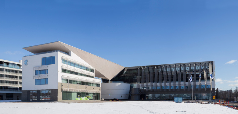 An essential element in the facade system is 60-mm thick UPM plywood, the system forming the structure of the exposed wooden window frames. The interiors abound in components of mechanical wood processing. Visitor meeting rooms and the corridor zones of office floors have curved ceilings made of ash-veneered UPM Grada boards. The walls of the visitor meeting rooms are clad with sound-absorbing Wisa-Phon panels with veneer finish.