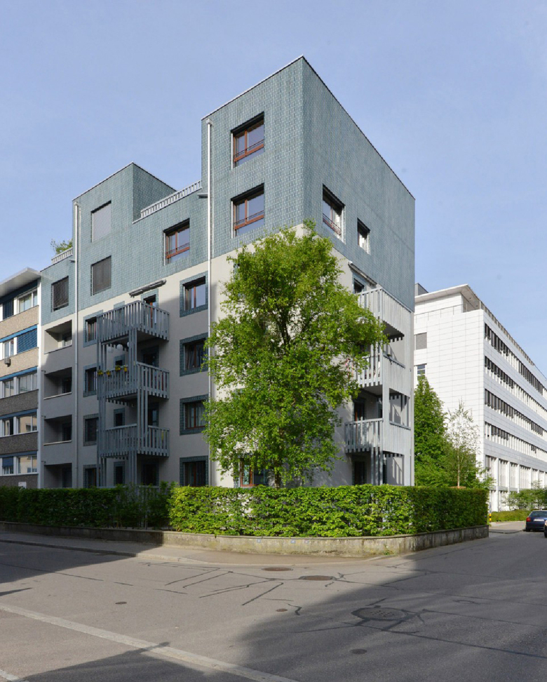 Durch diesen neuen zinnenartigen Gebäudeabschluss tritt das um 1941 erbaute Mehrfamilienhaus selbstbewusst in Erscheinung und wird sich im neuen Kontext behaupten. Unterstützt wird diese Absicht durch die Materialisierung und Detaillierung der Fassaden. Die unteren vier bestehenden Geschosse erhalten weiterhin eine verputzte Fassade, währenddem die Aufstockung in ein Plattenkleid (glasiertes Steinzeug) gehüllt wird.