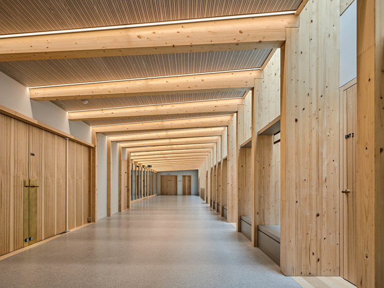 Das Raumprogramm der Kirche wurde mit einem Mehrzweckraum für hundert Gäste, einer Empore und einem abgetrennten Eltern-Kinder-Zimmer erweitert. Hierfür liess man den Kirchensaal bestehen und ersetzte das Konglomerat der Annexbauten durch einen eingeschossigen, klar strukturierten Holzbau. Der neue Anbau hat die Form zweier gegenläufig versetzter Pultdächer, an dessen Enden der grosse Mehrzwecksaal und die Unterrichtszimmer gesetzt sind. Zwischen den gross dimensionierten Mittelstützen fällt warm gefärbtes Tageslicht in das lang gestreckte Foyer. Die roh belassenen Holzbinder und silbrig lasierten Deckenelemente verleihen den Innenräumen einen säkularen Ausdruck und eine gedämpfte Akustik. Hingegen entwickelt im Kirchensaal das über die weisse Altarrückwand fallende Zenitallicht eine kontemplative sakrale Raumstimmung. Hier entfaltet sich für Chorgesang, Orgel und Rede eine üppigere Akustik mit längerem Nachhall. Empore und Eltern-Kinder-Zimmer mitsamt Orgel und Altar wurden in einer fein detaillierten Schreinerarbeit aus Braunkern-Eschenholz und Messing ausgeführt.