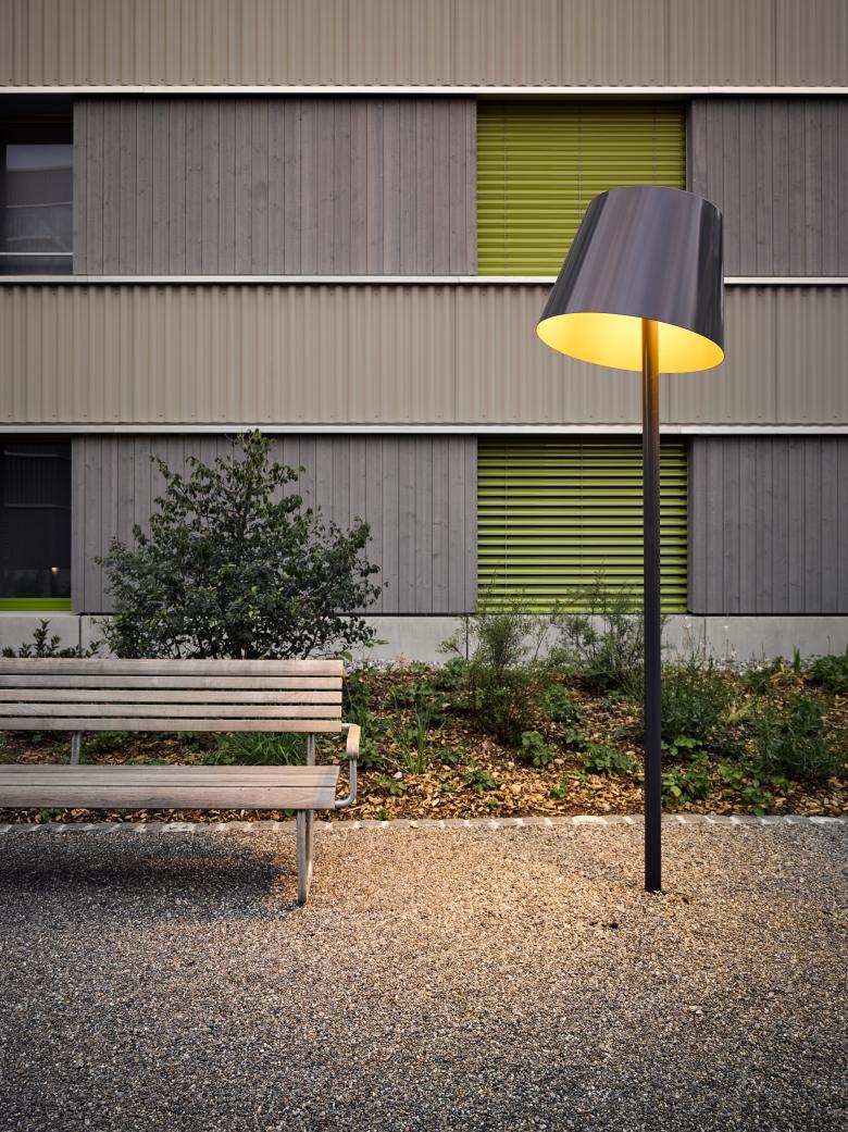 Die drei Wohnhäuser fügen sich in angemessener Massstäblichkeit in die L-förmige Parzelle und in das Siedlungsgefüge am Stadtrand zwischen Wohnzone und Friedhof ein. Analog der gegenüberliegenden GAIWO-Siedlung werden mit diagonal versetzt plazierten Baukörpern gefasste Aussenräume generiert. Mit annähernd quadratischen Gebäudegrundrissen und kurzen Fassadenlängen entsteht eine Anlage mit städtischer Dichte und gleichzeitiger Villenqualität. Durch die Setzung der Häuser entsteht zwischen den Volumen ein Siedlungsplatz - ein Ort der Begegnung und der gemeinsamen Erschliessung. Am strassenseitigen Kopf der Siedlung verknüpft sich die Erschliessung mit der gegenüberliegenden, bestehenden Alterssiedlung. Hier führt ein Fussweg vom Trottoir zum Siedlungsplatz.