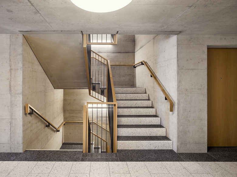 Die Wohnungen weisen einige gemeinsame Qualitäten auf; eingrosszügiges Entrée erschliesst Bad, Reduit, Zimmer und Wohnbereich. Die Reduits verstehen sich als gut zugängliche, begehbare Schrankräume. Sämtliche Wohnräume orientieren sich zweiseitig zum Aussenraum, die meisten Bäder und Küchen sind anden Fassaden angeordnet und natürlich belichtet. An den Fassadenecken erweitern die einseitig geschützten Balkone den Wohnraum.