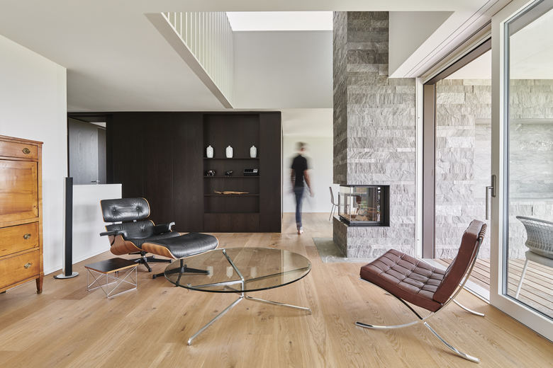 Der Wohnraum besteht aus drei prägenden Körpern und Materialien: Das weisse Treppengeländer, indem das herabfallende Tages- und Kunstlicht subtil changiert, der Küchenkörper in dunkler Räuchereiche und der markante Cheminéekörper aus gebrochenem Valser Quarzit.