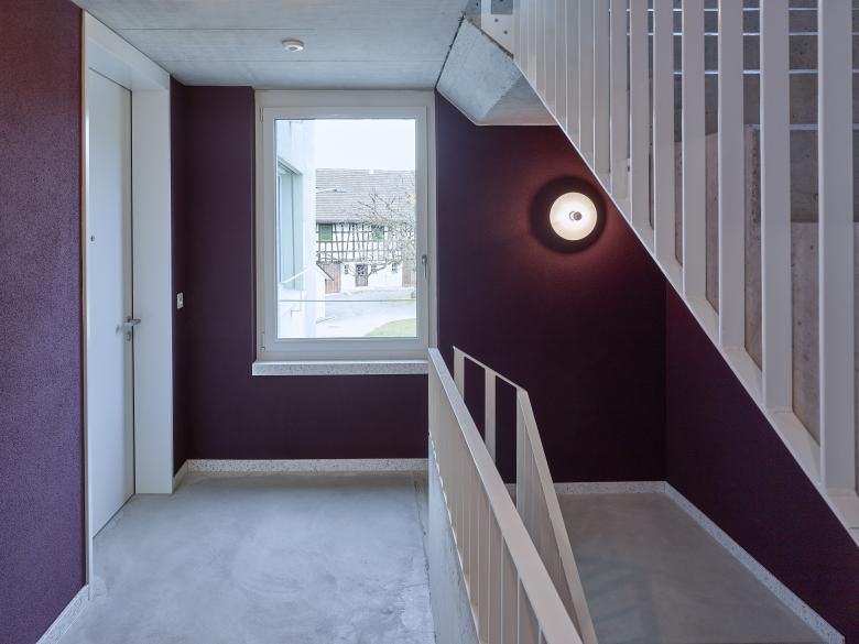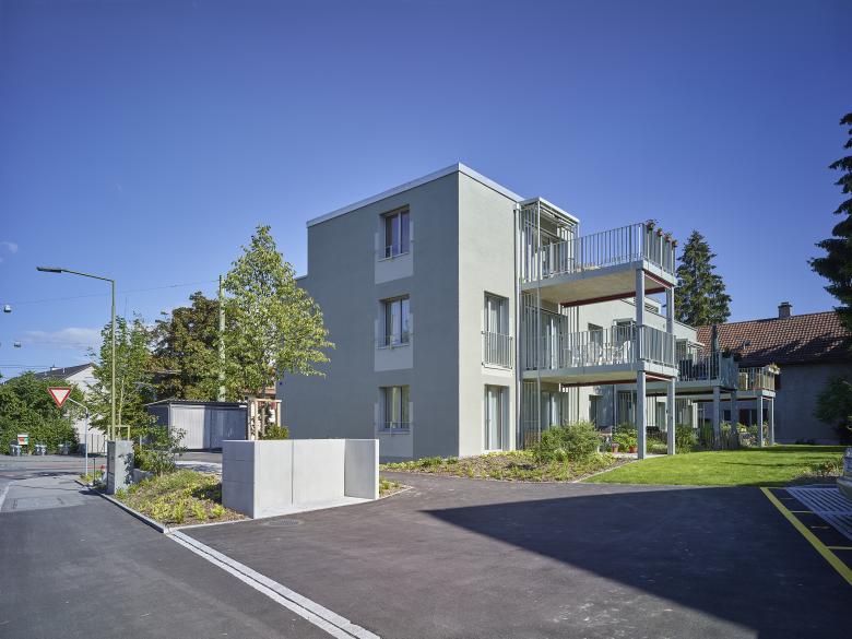 Der Neubau steht neu parallel zur lärmbelasteten Stadlerstrasse in der Wohnzone W2/2.0. Im Bereich der Kreuzung wird der Bau dreigeschossig und definiert so die Eingangssituation. Lärmabgewandt gegen Westen orientieren sich die Wohnräume und Balkone. Trotz der nun verschärften Lärmschutzpolitik wurden Wohnungen entwickelt, welche die Strasse nicht von den Wohnungen verbirgt, sondern durch diese spannende Innenräume erzeugt werden können.
