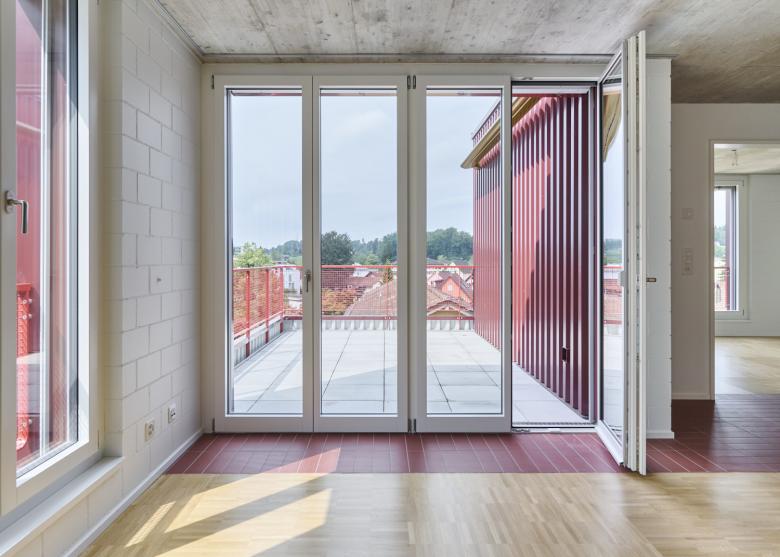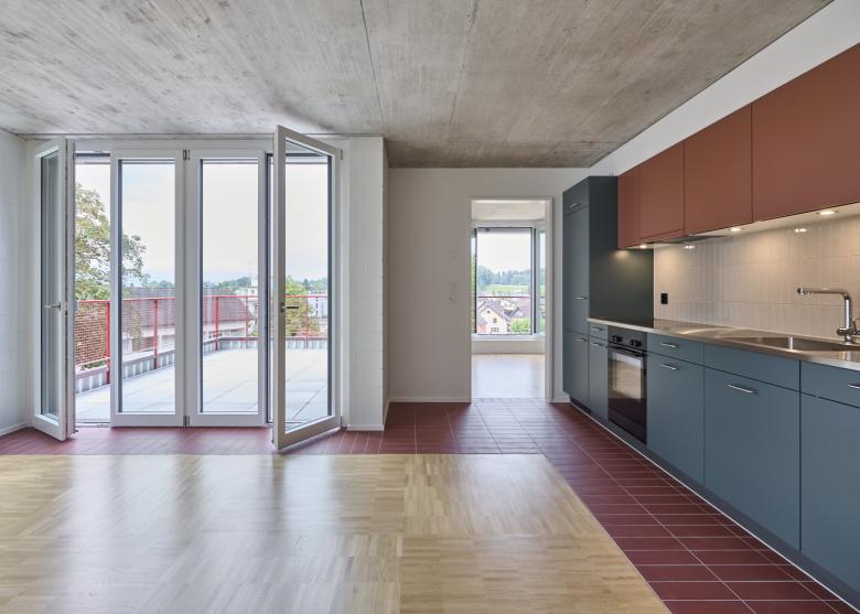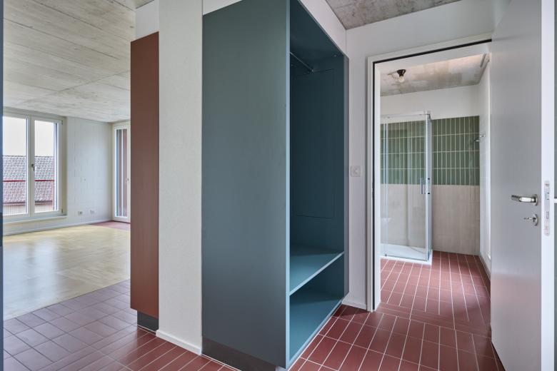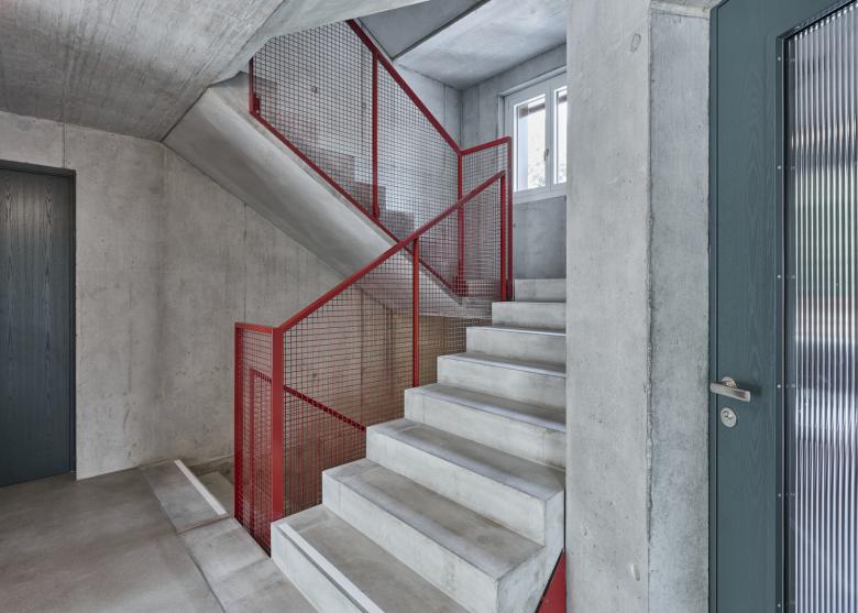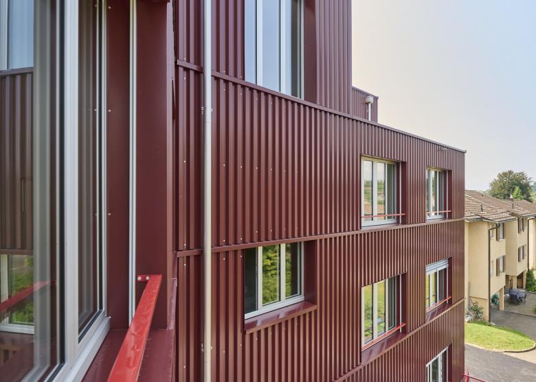 Der architektonische Ausdruck folgt nicht dem heterogenen Quartier des Lindenberges, sondern der allgegenwärtigen Industriekultur von Rüti, welche vorwiegend durch Gebäude aus der Textil- und Webmaschinenindustrie des 19. und 20. Jahrhunderts geprägt ist. Die Fassadenhaut aus dunkelrotem Trapezblech und roten Geländer aus Metallgitter, als auch das betonrohe Treppenhaus und die Materialisierung der Wohnungen folgen dieser Referenz. So inspirierten Böden und Wände von Industriehallen, die in Folge der Zeit und diverser Anpassungen zu Flickenteppichen wurden, zum funktional-pragmatischen Einsatz von Boden, Wand und Deckenoberflächen.