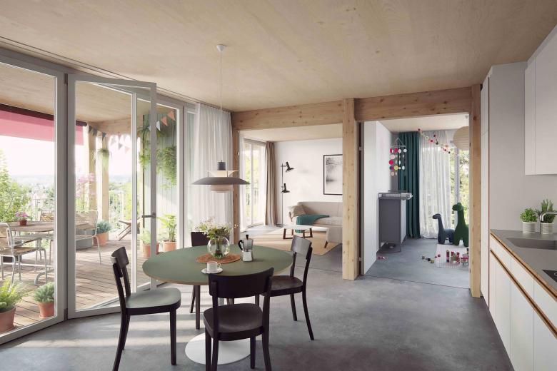 Waschküche, Möglichkeitsraum, Co-Working-Space und Gewerbefläche. Ab dem 1. Obergeschoss werden auf fünf Vollgeschossen 20 2.5- bis 4.5-Zimmer Wohnungen angeboten. Das Attikageschoss gehört den fünf 1-Zimmer Wohnungen, welche alle über einen direkten Zugang zum Dachgarten verfügen. Die Balkonschicht, der Dachgarten, die gemeinschaftlichen Bereiche