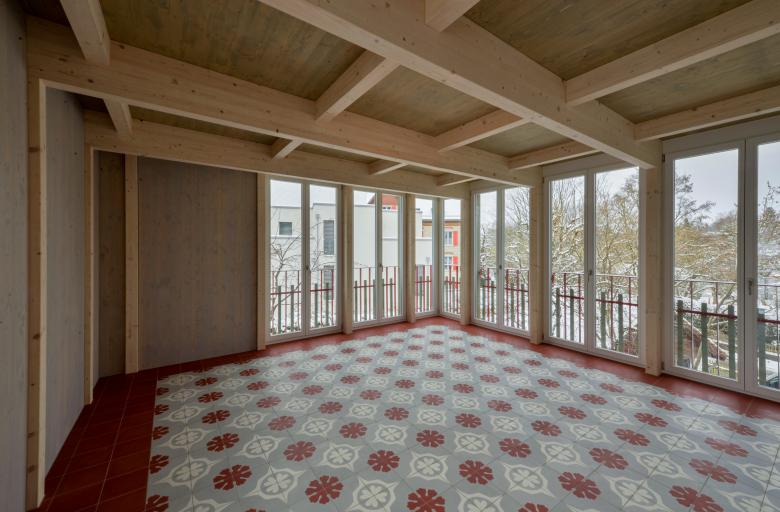 Mit dem Umbau wurde einerseits eine energetische Sanierung mit Sole-Wasser-Wärmepumpe vorgenommen, andererseits die Raumaufteilung den neuen Anforderungen angepasst, ohne die Zeitspuren dabei ganz zu verwischen. Der Aufbau seitens Garten ermöglichte im ersten Stock eine Ergänzung des Raumangebotes der Familienwohnung um ein helles Jahreszeitenzimmer. Die Zimmer sind dabei enfilade-artig miteinander verbunden und vermitteln ein grosszügiges Raumgefühl. Alle Oberflächen wurden komplett saniert, der Fischgratboden und die alten Fliesen freigelegt und aufgefrischt. Das Dachgeschoss wurde mit zwei Kinderzimmern und einem Badezimmer vollständig ausgebaut und erweitert so das Platzangebot der Familienwohnung.