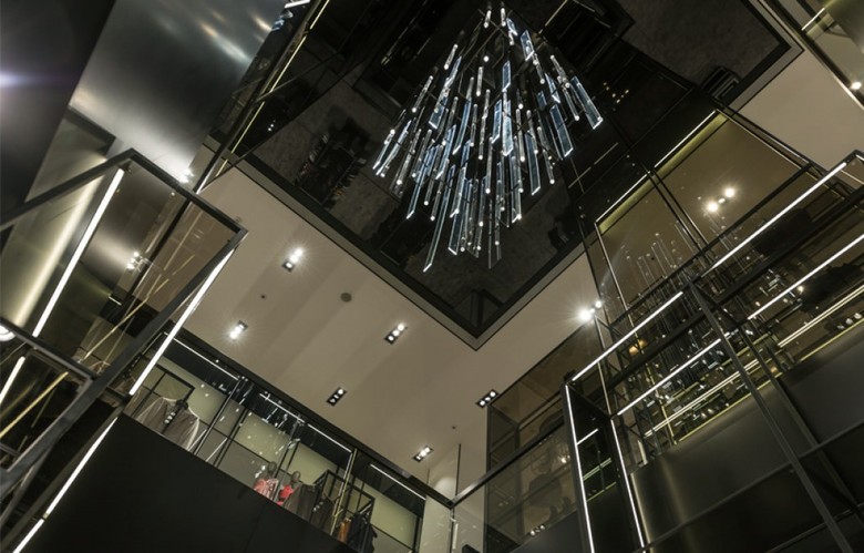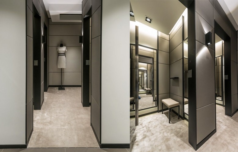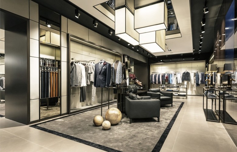 Auf über 1300 m² Verkaufsfläche präsentiert sich die Marke HUGO BOSS mit der üblichen klaren Formensprache. Die hochwertigen Materialitäten bilden ein konstrastreiches Ensemble zwischen hellen und dunklen Farben, harten und weichen Oberflächen. Es wurde sehr viel Wert auf die Gliederung der Wände und die dadurch harmonische Integration der Wandmöbel gelegt. Moderne Lichtakzente sorgen für gezielte Highlights.