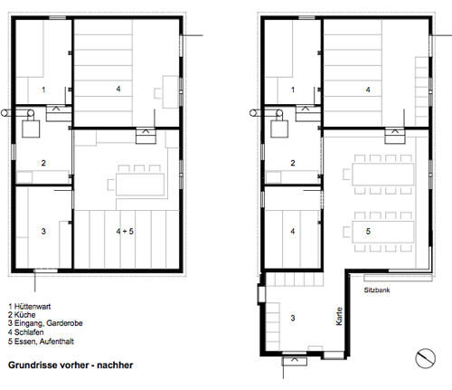 Die Gruebenhütte ist eine kleine Selbstversorgerunterkunft für Alpinisten und Wanderer, die das Einfache schätzen. Sie thront auf einem Felssporn über dem Gruebengletscher im Grimselgebiet. Ausschlaggebend für den Umbau war das Missverhältnis von 28 Schlafplätzen zu 8 Sitzplätzen und damit verbunden ein fehlender eigenständiger Aufenthaltsraum. Um dies zu verbessern, wurde der Grundriss überarbeitet, die Nutzungen der Räume umverteilt und ein neuer Eingangsbereich als Anbau geschaffen.