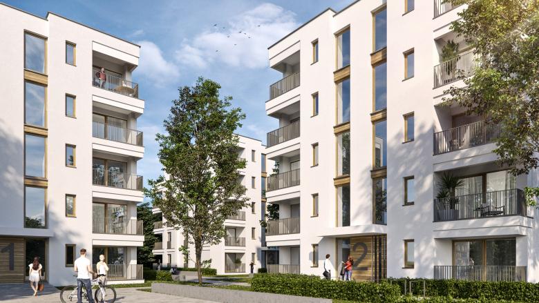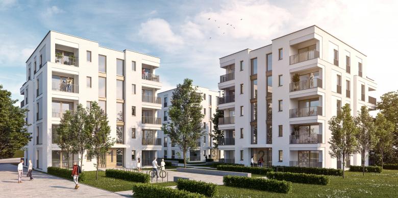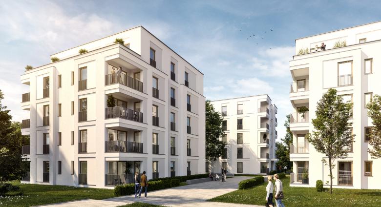 Die Struktur der grünen Dreiecke entlang der Frankfurter Straße wird weiter gestärkt. Die drei Gebäude sind in Aufteilung und Grundrissgestaltung identisch. Pro Geschoss beherbergen sie vier Ein-Personen-Appartements. Das Treppenhaus ist hierbei so gesetzt, dass der Zugang im EG ohne Flächenverlust und Grundrissänderung möglich ist. Im einseitig zurückspringenden Staffelgeschoss entfällt eine Wohneinheit. Insgesamt werden lediglich drei unterschiedliche Wohnungstypen erforderlich. Jede Wohnung verfügt über eine Loggia. Die Öffnung/ Geschlossenheit der Loggia variiert je nach Ausrichtung der Wohnung. Eine Tiefgarage mit 40 erforderlichen Stellplätzen unterbaut 50% der Grundstücksfläche. In den Untergeschossen sind weiterhin Kellerräume, Fahrradkeller und Technikflächen untergebracht. Die Gebäude werden als monolithische, weiß verputzte Baukörper in hochwärmedämmendem Poroton-Mauerwerk errichtet. Die Fassaden werden durch Rücksprünge/ Faschen gegliedert. Diese werden konstruktiv über Verminderung der Mauerwerksstärke (bei gleicher Wärmedämmeigenschaft) hergestellt. Fassade und Rücksprünge werden über die Putzkörnung unterschieden. Die Faschen setzen sich dabei mit einer glatt gefilzten Oberfläche vom Rauputz der Fassade ab. Die Stabgeländer der bodentiefen Fenster und Loggien werden als gestaltprägendes Element mit variierenden Stababständen (“Barcode”) ausgeführt. Der warme, dunkelgraue Farbton sorgt für einen Kontrast zur weißen Fassade und setzt gestalterische Akzente. Die Fenster werden als Kunsstoffprofile mit einer Folierung in Holzoptik ausgeführt. Diese Oberfläche findet sich zusätzlich in der Eingangstür wieder, die mit ihrer großflächigen Holzvertäfelung für einen einladenden und repräsentativen Zugangsbereich sorgt. Auskragende Vordächer markieren die Eingänge zusätzlich und tragen zur Adressbildung bei.
