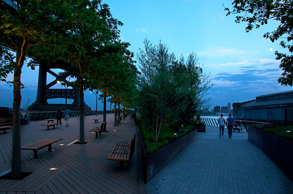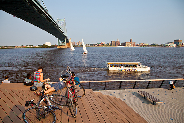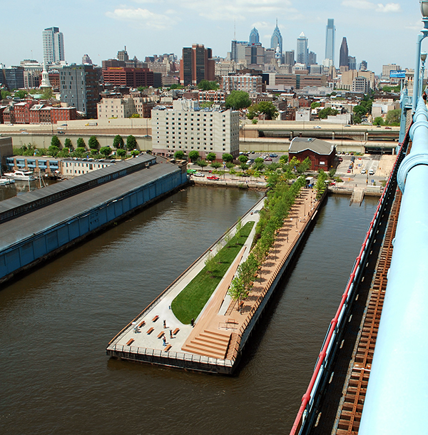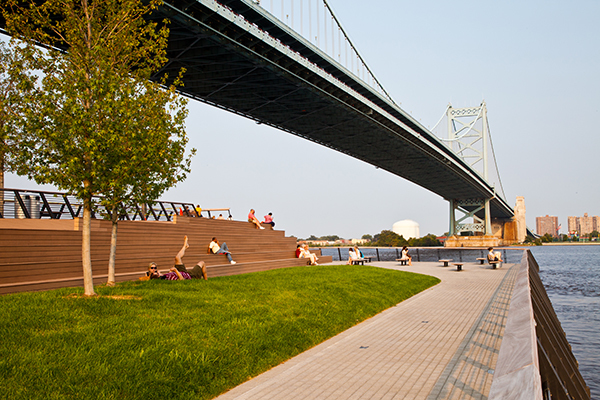 The Race Street Pier is one of the first public spaces to be realized as part of the ambitious Civic Vision for the Central Delaware Riverfront.  As such, it was designed to create a strong physical experience that reconnects the City to the River, activates the water’s edge and establishes the pier as a distinctive new public park for the people of Philadelphia. The physical design of the pier is split into two levels – an upper level with a grand sky promenade and a lower level for water-related activities and passive recreation.  A dramatic ramp rises along the north face of the pier below the Ben Franklin bridge, dramatizing the sense of arriving in the space of the river.  A lower terrace supports a lawn with generous seating and social spaces.