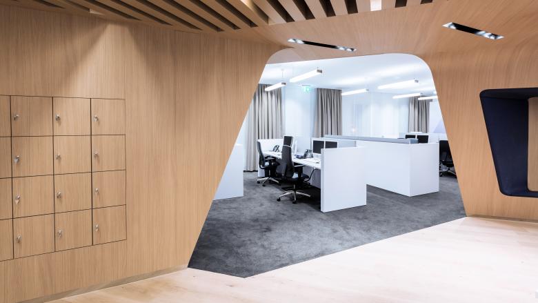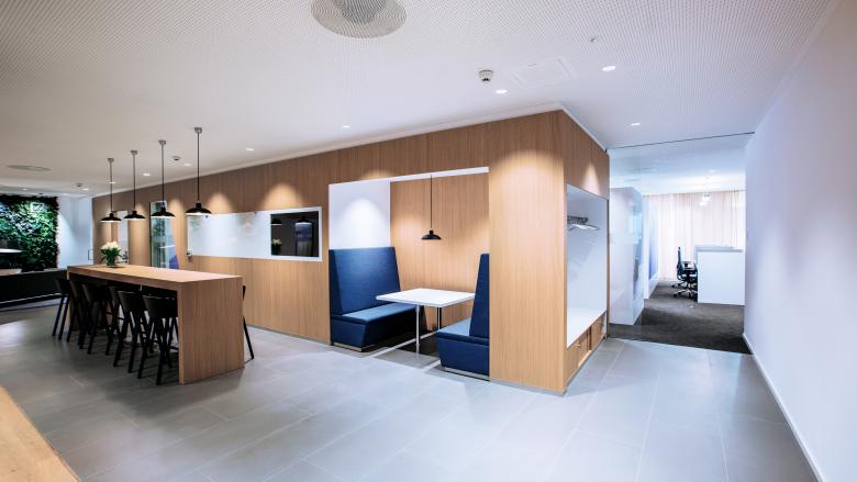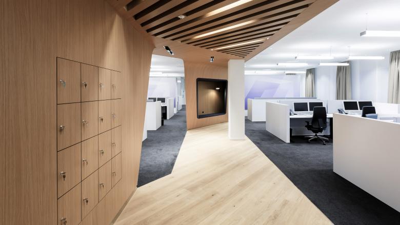 Der »Connecting Core« definiert zwei funktionale Bereiche: Im »Customer Advisory« befinden sich Shared Desk-Arbeitsplätze mit CI-konformen Videorückwänden, die den Raum zusätzlich strukturieren. Der Bereich »Social Hub« lädt die Mitarbeiter mit inspirierender Atmosphäre und gemütlichen Sitzgelegenheiten ein, sich auszutauschen und zu erholen.